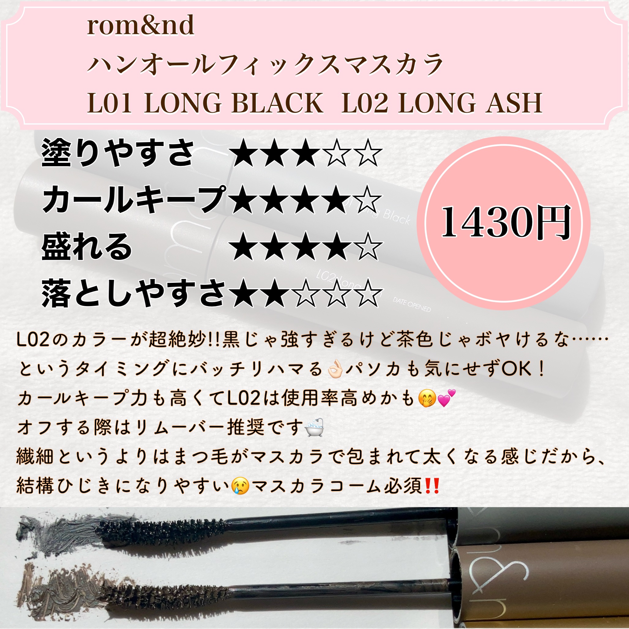 しっかりカールキープの透け感マスカラ▪︎rom&nd▫︎ハンオールフィックスマスカラ▫︎¥1,430※香りなしロムアンドのロングタイプのマスカラ手持ちの2色をご紹介です!繊細でロングなまつ毛に仕上がりますカールキープ力もしっかりあります!その...