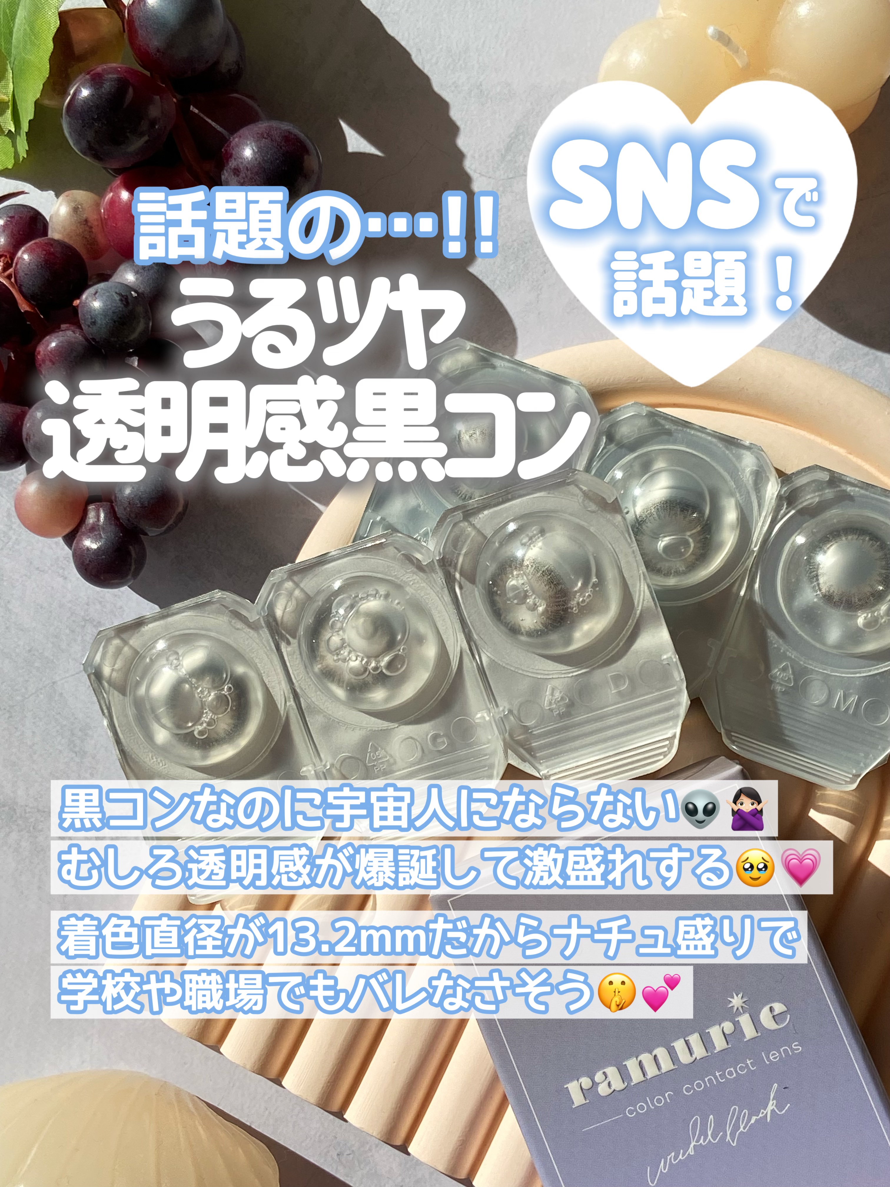 - 佐藤ノアプロデュース&イメージモデル「ラムリエ(ramurie)」 「今日 もっと ときめく私に」をコンセプトに、繊細なデザインとカラーが、泡のように重なって、 瞳にきらめきを閉じ込めるナチュラル系ビー玉カラコン。 裸眼系~ニュアンス系までいろんな「なりたい」から選べる7色のラインナップ。 その日の気分で選んで、いつもの日常にときめきをプラス♥