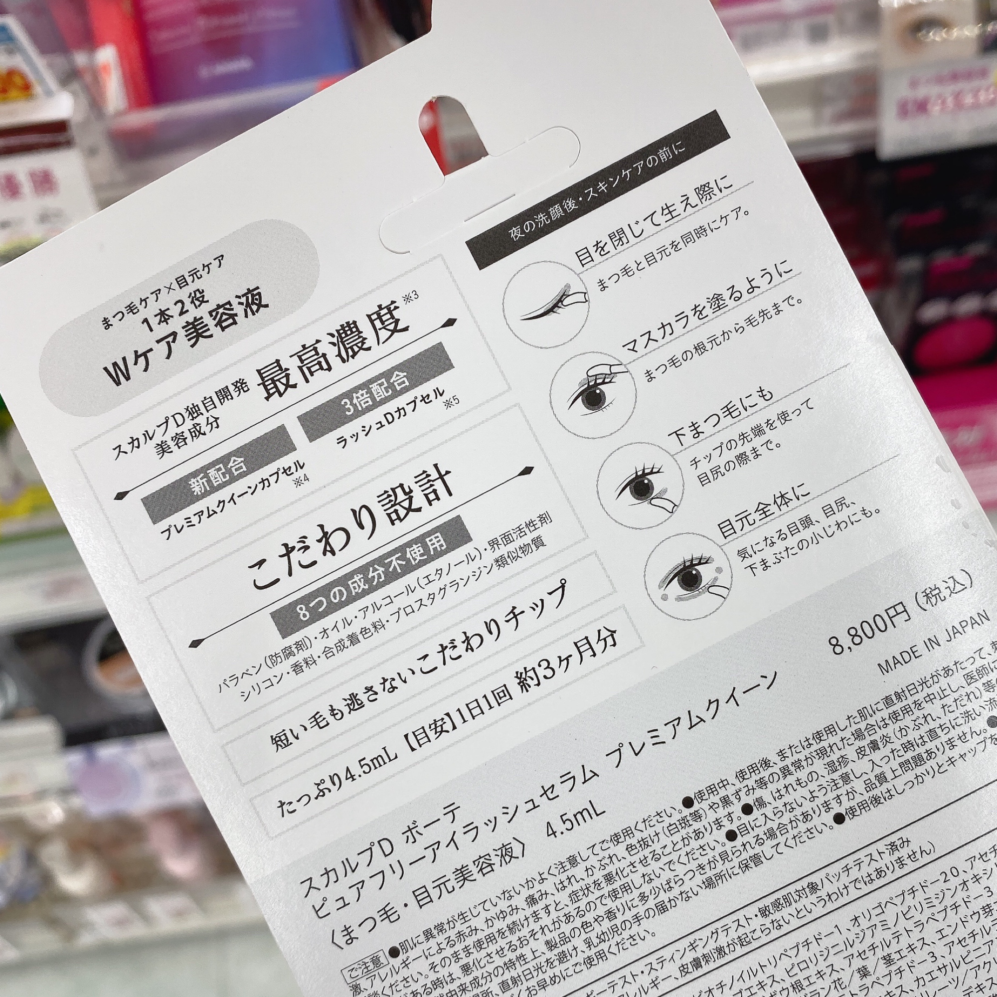 - スカルプDまつ毛美容液シリーズ史上まつ毛美容成分最高濃度※1♪ 「ラッシュDカプセル」3倍※2に加え、独自開発の「プレミアムクイーンカプセル」※3 を配合。 さらに「目元ケアもできるまつ毛美容液」として目元のお肌にうるおいを与えて、乾燥による小じわを目立たなくします※4。 使いやすさ・やさしさにこだわった、ふわふわカールチップ採用で根元からも塗りやすく、敏感な目元にやさしい使い心地。 シリコン、オイル、アルコール(エタノール)、防腐剤(パラベン)、香料、合成着色料、界面活性剤、プロスタグランジン類似物質の8つの成分不使用のピュアフリー設計を実現。まつ毛エクステ、まつ毛パーマにも使え、1日1回のケアでもOKとなっています。 ※1.スカルプDまつ毛美容液シリーズ内最高濃度のこと※2.保湿成分、白金、ビオチノイルトリペプチド-1、パンテノール、グリセリン、ピロリジニルジアミノピリミジンオキシド、シスチン、グルタミン酸、当社SDBピュアフリーアイラッシュセラムSSC2と比較※3.保湿成分、白金、アセチルテトラペプチド-3、アカツメクサ花エキス、ゴボウ根エキス、オオミテングヤシ果実エキス※4.効能評価試験済み