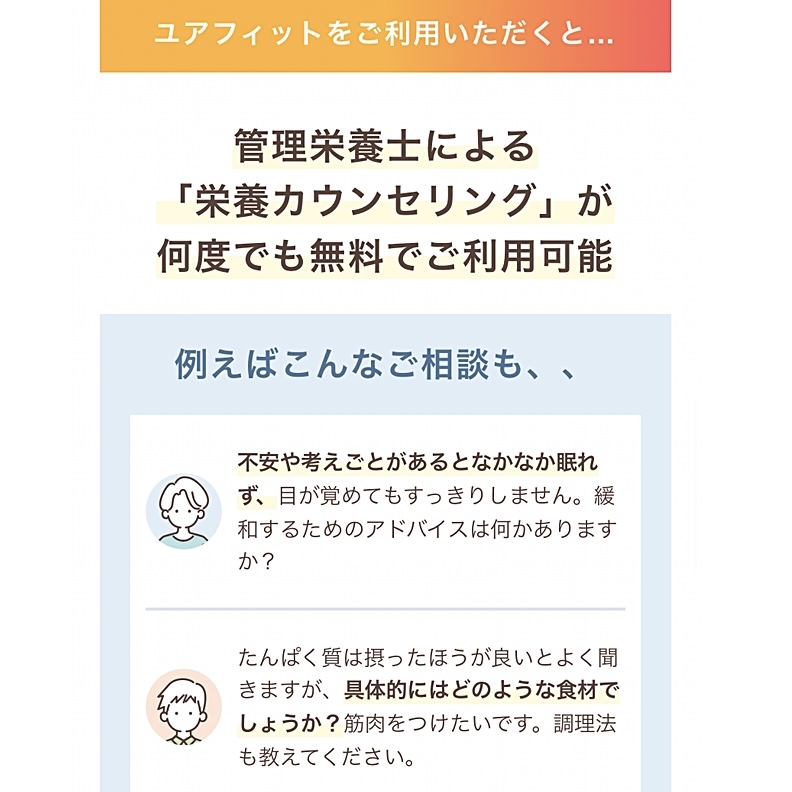 - 「ユアフィット」は、管理栄養士監修の食生活に関するアンケートにお答えいただくとあなたのライフスタイルを分析し、一人ひとりのライフスタイルにフィットしたサプリメントを組み合わせてご提案します。お客様自身でカスタマイズも可能です。また、ご利用中は管理栄養士によるチャット形式の栄養カウンセリングが何度でも無償で受けられるので、食生活に関する心配事をお気軽にご相談いただけます。 定期価格:6048円(税込)~ ※お選びいただくサプリメントの種類によって異なります。