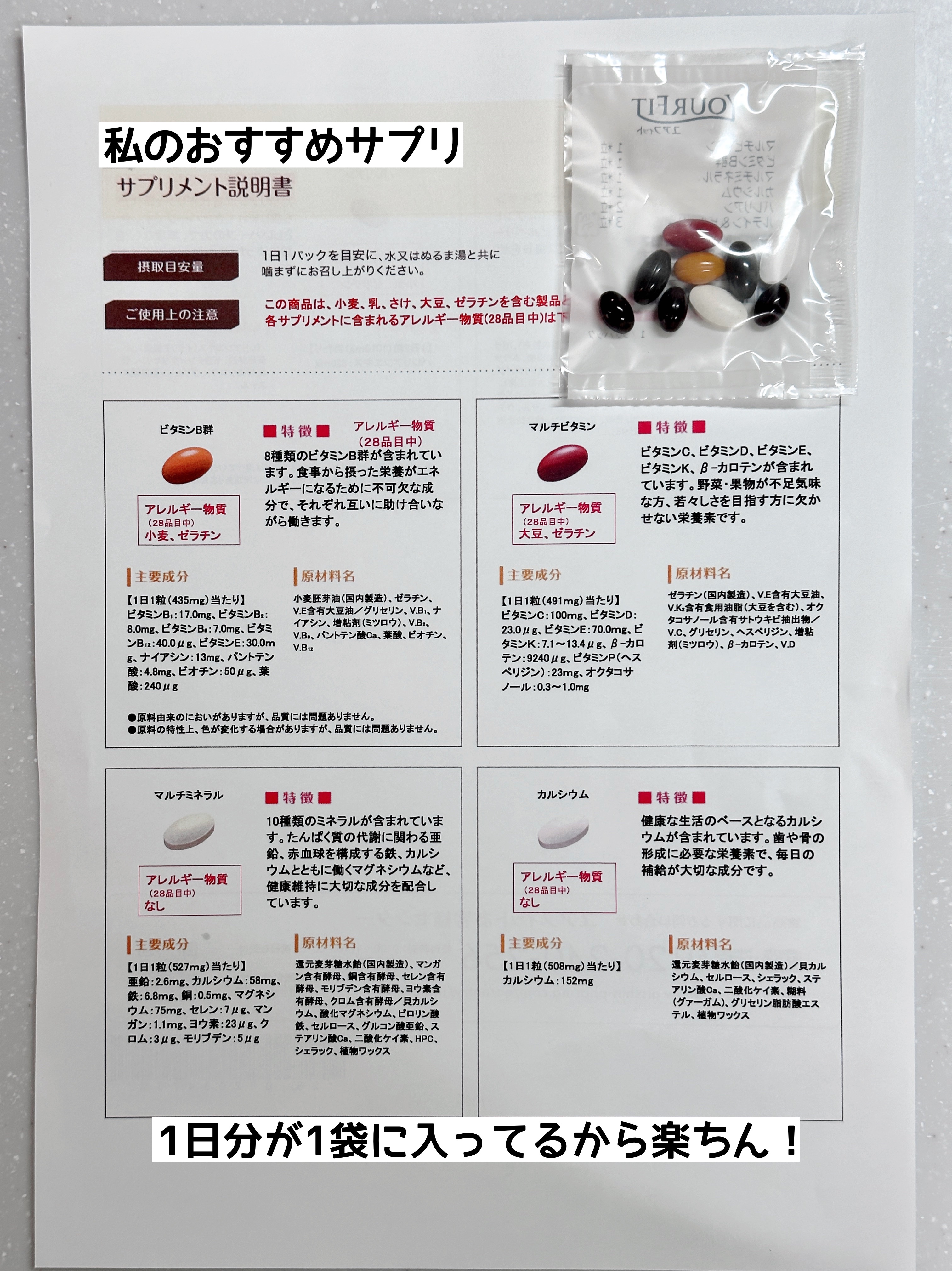 簡単なアンケートに答えていくだけで、自分の栄養状態(なにが不足してる・なにを摂取し過ぎてる)を分析して1人1人違うサプリメントを組み合わせてオリジナルのものを紹介してくれます。 実際に届いたものは1日分ずつ包装されているので、数種類飲むのに手軽で時短でした! サプリを数種類飲むときに、いくつもボトルやパウチを開け締めするのは面倒だったので「YOURFIT」は良かったです😊 1つ1つの効能が詳しく説明されていたり、アンケートに基づいた生活習慣や食についてのアドバイスもしてくれるのが勉強になりました。