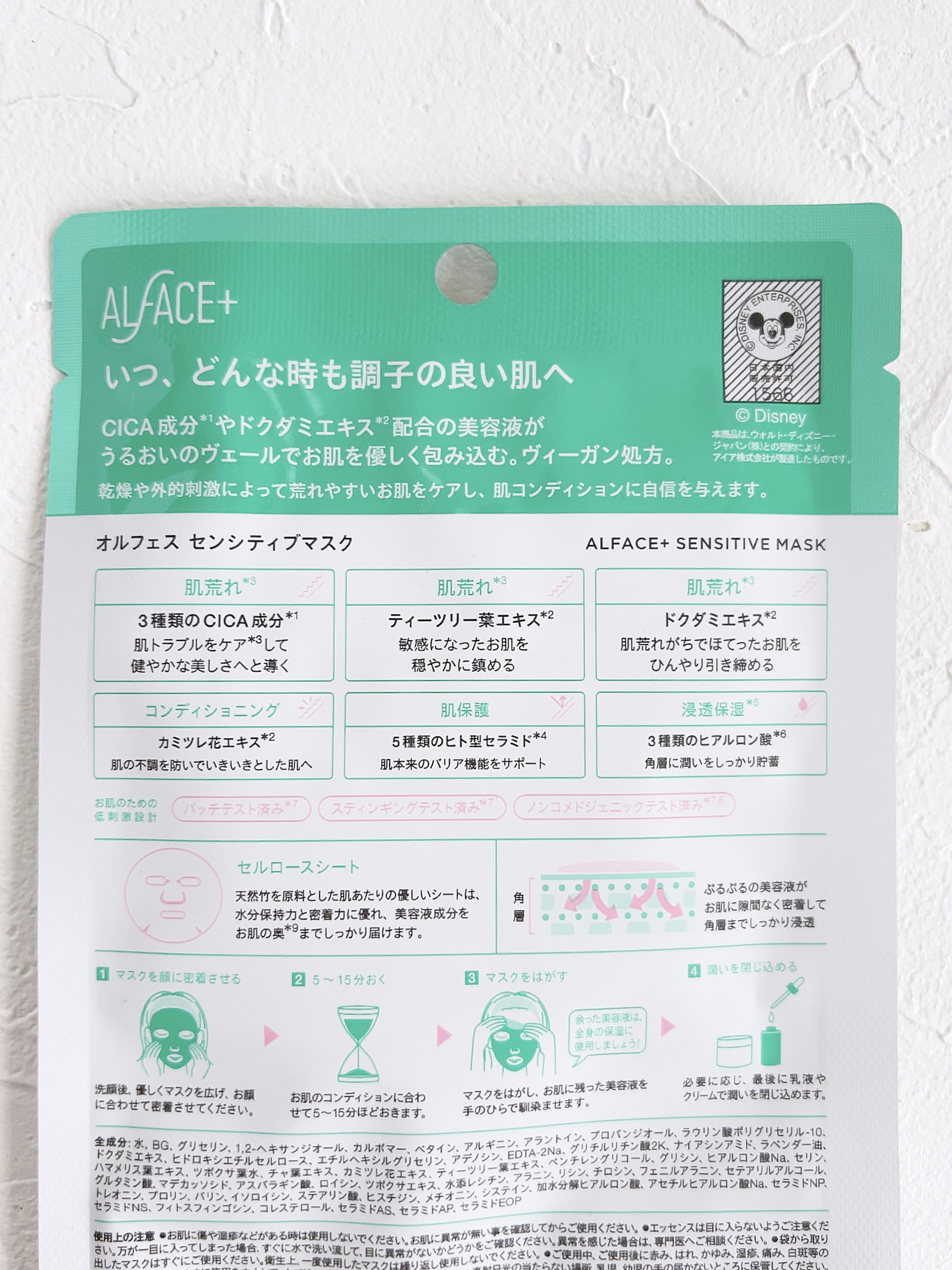 - <Disney限定パッケージ(ウエルシア限定)> 水、BG、グリセリン、1,2-ヘキサンジオール、カルボマー、ベタイン、アルギニン、アラントイン、プロパンジオール、ラウリン酸ポリグリセリル-10、ドクダミエキス、ヒドロキシエチルセルロース、エチルヘキシルグリセリン、アデノシン、EDTA-2Na、グリチルリチン酸2K、ナイアシンアミド、ラベンダー油、ハマメリス葉エキス、ツボクサ葉水、チャ葉エキス、カミツレ花エキス、ティーツリー葉エキス、ペンチレングリコール、グリシン、ヒアルロン酸Na、セリン、グルタミン酸、マデカッソシド、アスパラギン酸、ロイシン、ツボクサエキス、水添レシチン、アラニン、リシン、チロシン、フェニルアラニン、セテアリルアルコール、トレオニン、プロリン、バリン、イソロイシン、ステアリン酸、ヒスチジン、メチオニン、システイン、加水分解ヒアルロン酸、アセチルヒアルロン酸Na、セラミドNP、セラミドNS、フィトスフィンゴシン、コレステロール、セラミドAS、セラミドAP、セラミドEOP