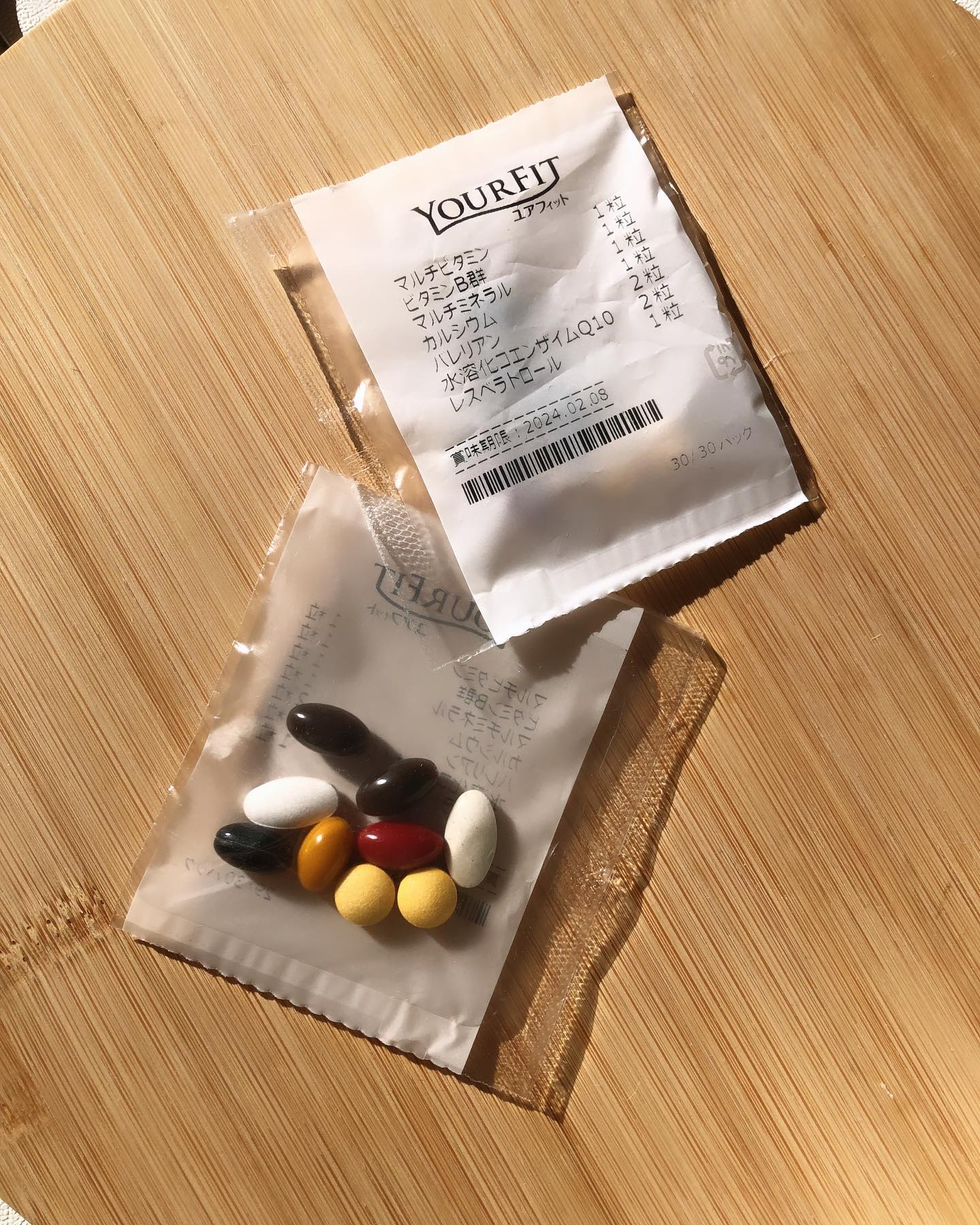 簡単なアンケートに答えていくだけで、自分の栄養状態(なにが不足してる・なにを摂取し過ぎてる)を分析して1人1人違うサプリメントを組み合わせてオリジナルのものを紹介してくれます。 実際に届いたものは1日分ずつ包装されているので、数種類飲むのに手軽で時短でした! サプリを数種類飲むときに、いくつもボトルやパウチを開け締めするのは面倒だったので「YOURFIT」は良かったです😊 1つ1つの効能が詳しく説明されていたり、アンケートに基づいた生活習慣や食についてのアドバイスもしてくれるのが勉強になりました。