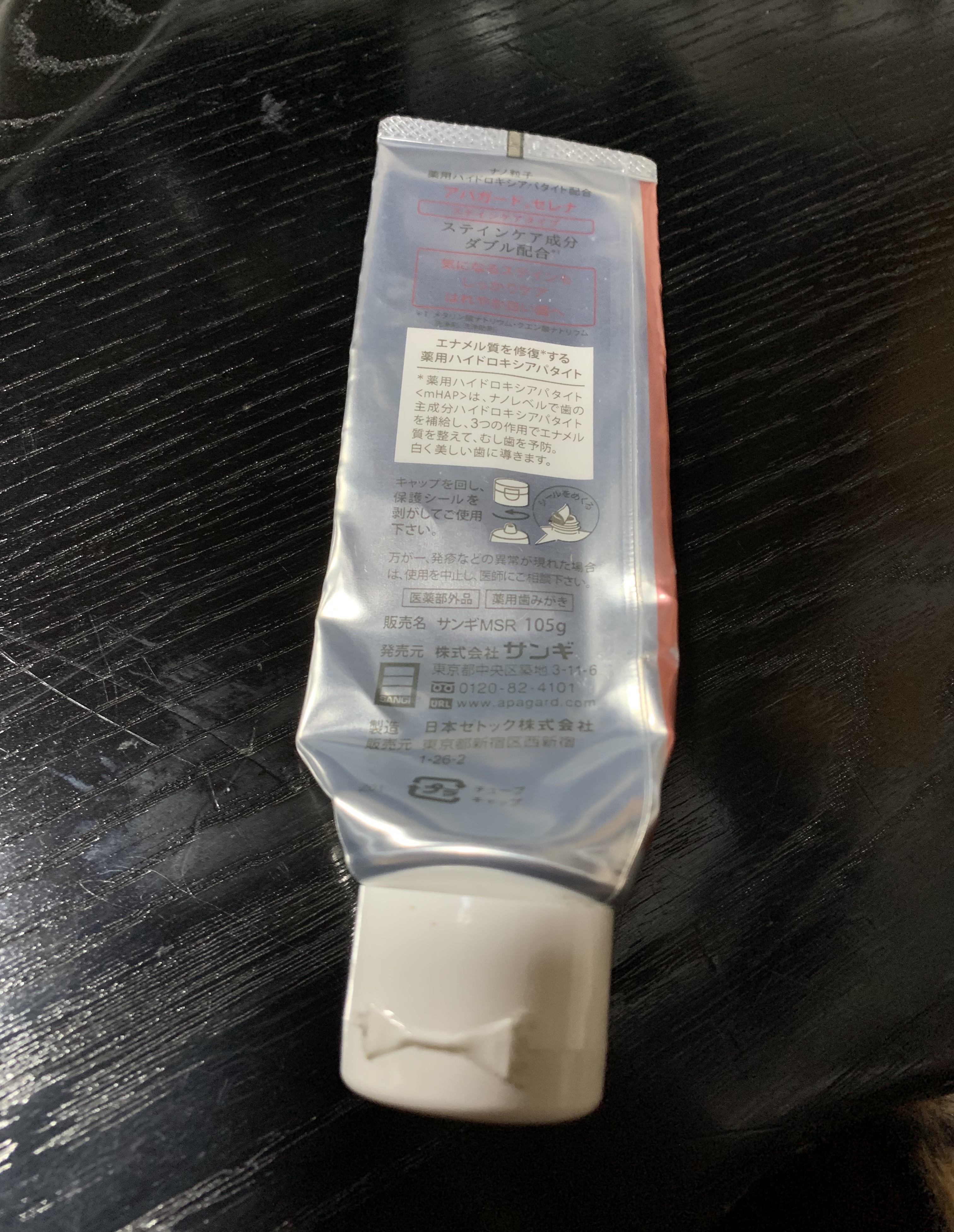 - 【医薬部外品】 美白歯みがき「アパガード」シリーズのステインケアタイプ。サンギ開発のむし歯予防成分「薬用ハイドロキシアパタイト」を配合。歯とほぼ同じ成分(歯のエナメル質の97%はハイドロキシアパタイト)で、エナメル質にアプローチ! さらにステインケア成分をダブル配合*し、コーヒーや紅茶・ワインなどの気になる着色汚れを落とします。 ステインケアではれやか白い歯に。 *メタリン酸ナトリウム(洗浄剤)・クエン酸ナトリウム(洗浄助剤) ●医薬部外品/薬用歯みがき 販売名:サンギMSR