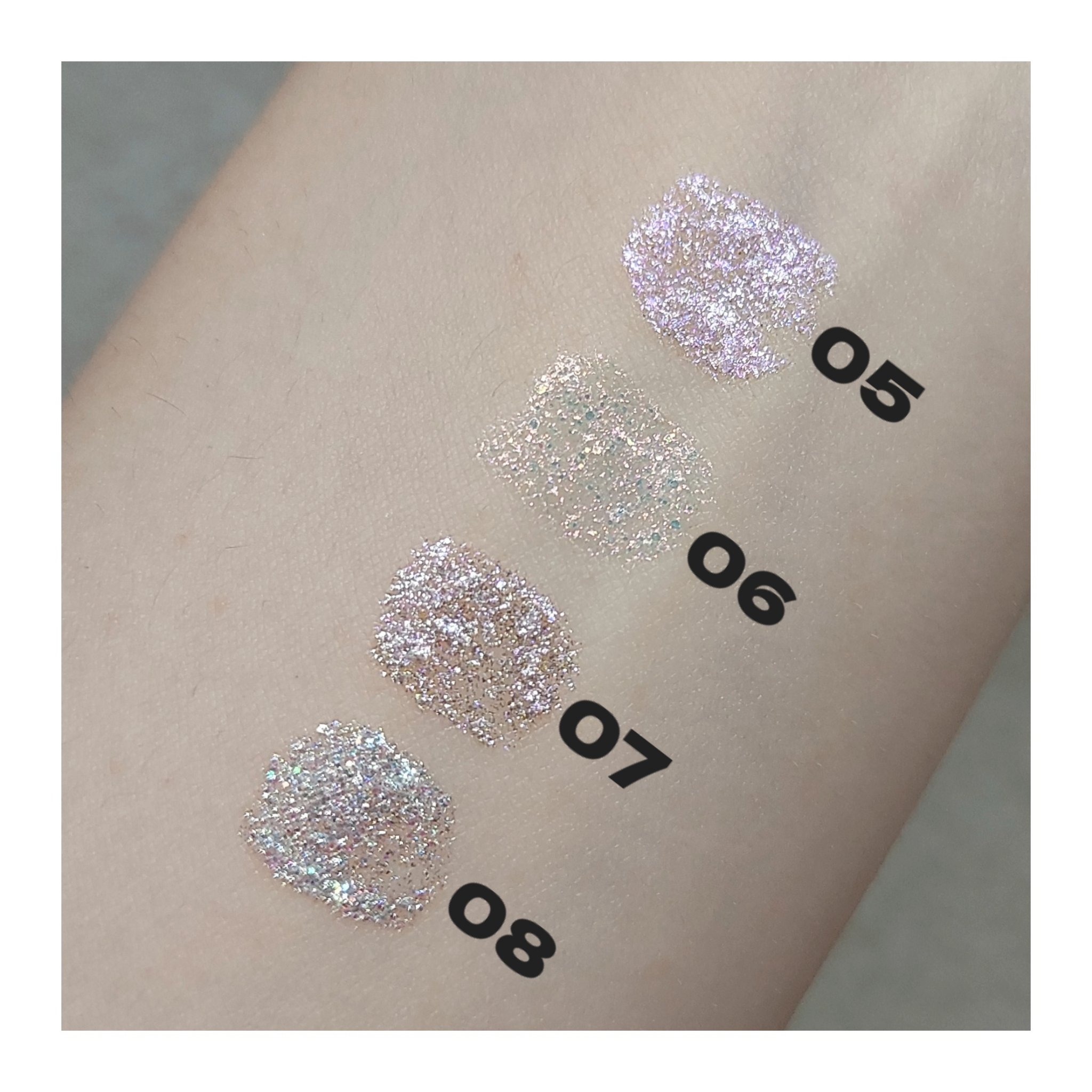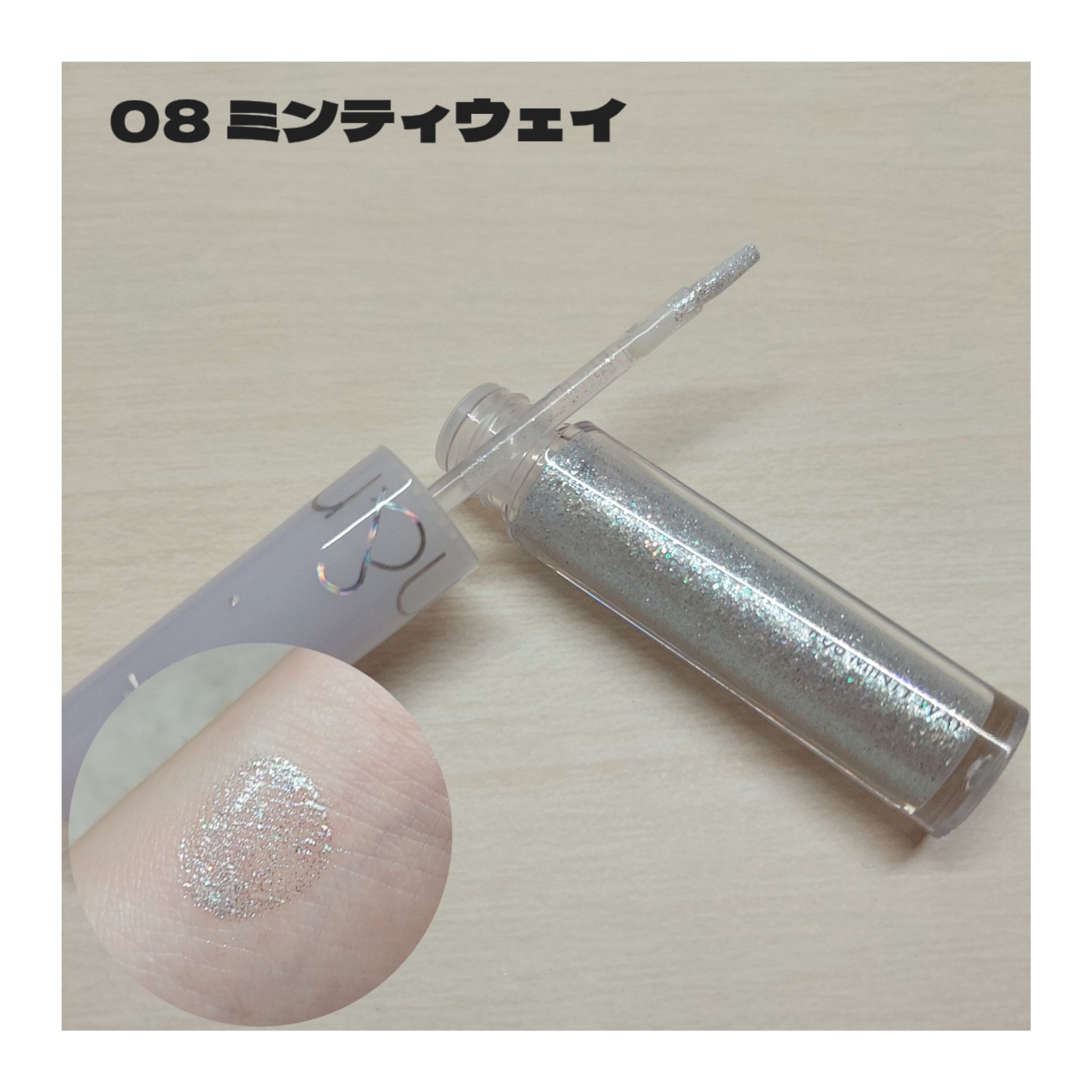 rom&ndから久しぶりの新色グリッターが可愛すぎた🥹 筆が細筆で涙袋に塗りやすい形になってます! 元々ある既存の色味より柔らかめの色味が多いので誰でも使いやすい色味かなと思います👍🏻🤍 08は緑っぽくて使いずらそうなイメージですが塗ってみるとそこまで緑に発色はしないので薄く付けたりラメのみを抽出して塗ると使いやすいです︎🫶🏻🎀