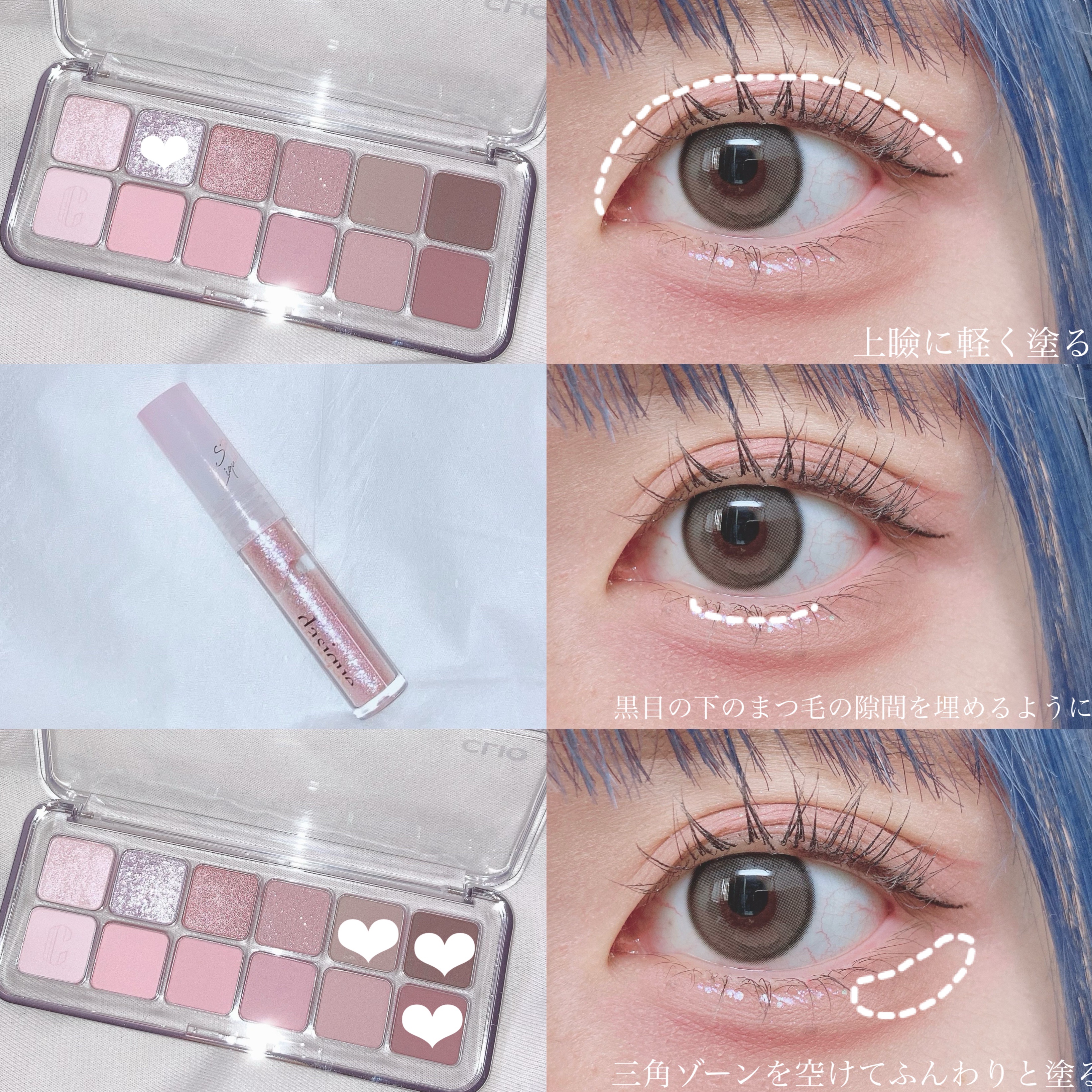 アイシャドウ👀・CLIOプロ アイ パレット01SIMPLY PINK グリッター✨・PERIPERAデュオ ポケット グリッター シャドウ03SALTED SUGARPLUM 涙袋のコンシーラー👧・キャンメイクカラーミキシングコンシーラーオレンジベージュ マスカラ💇♀️・rom&ndハンオールフィックスマスカラL02LONG ASH アイライン✏️・キャンメイククリーミータッチライナーダークブラウン・CEZANNE極細アイライナーEX20ブラウン