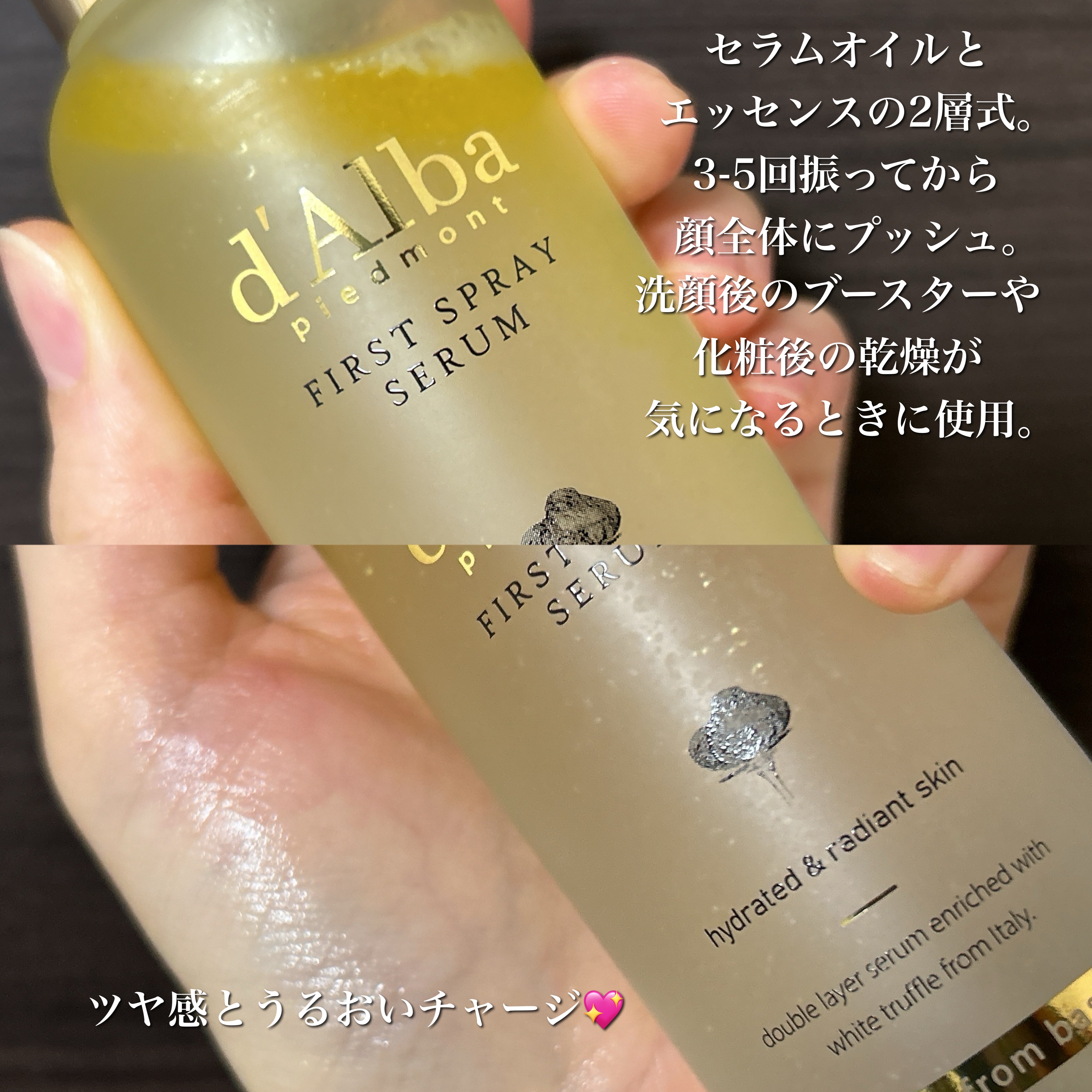 速攻ツヤミストの愛称でバズったミスト🩵 吹きかけた瞬間からお肌に潤いをチャージし上品な陶器肌へ✨ セラムとオイルの二層タイプの保湿ミスト💗 しっかり振ってから使ってね✨ 内側はしっとり、肌表面はオイルで自然なツヤのある仕上がりに♡ お肌の水分と油分バランスが崩れがちな人におすすめ♪