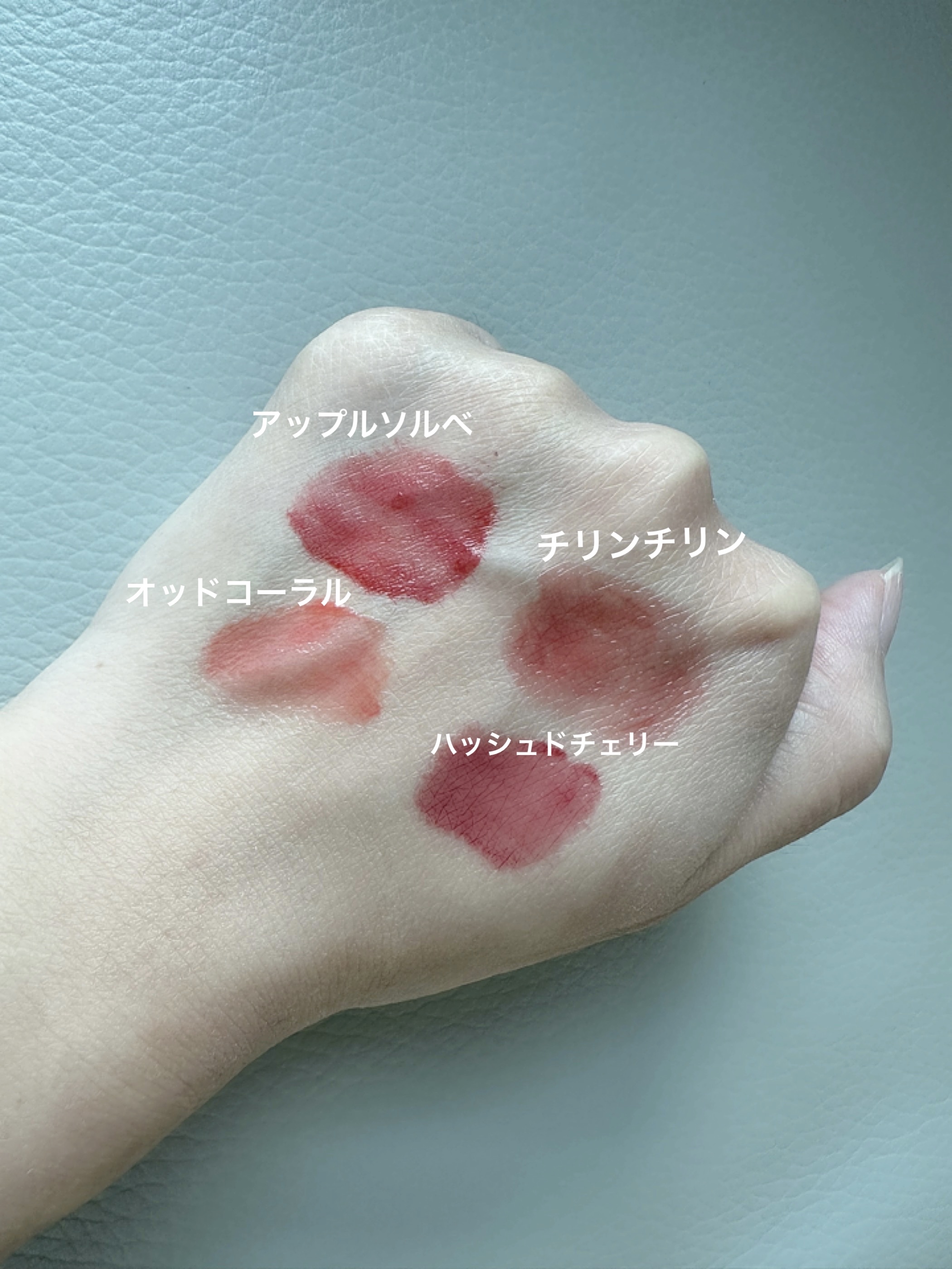 - <アップルシャーベット> 水、リンゴ酸ジイソステアリル、ビスジグリセリルポリアシルアジペート-2、ダイマージリノール酸ダイマージリノレイルビス(ベヘニル/イソステアリル/フィトステリル)、水添ポリイソブテン、ジグリセリン、ジフェニルジメチコン、セチルPEG/PPG-10/1ジメチコン、トリメチルシロキシフェニルジメチコン、ポリソルベート60、ペンチレングリコール、イソステアリン酸ソルビタン、イソステアリン酸ポリグリセリル-4、フェノキシエタノール、(アクリル酸ヒドロキシエチル/アクリロイルジメチルタウリンNa)コポリマー、セテアレス-20、スクワラン、香料、ジラウラミドグルタミドリシンNa、エチルヘキシルグリセリン、エチレンジアミンジコハク酸3Na、黄5、赤227、赤104(1)、黄4 <オッドコーラル> 水、リンゴ酸ジイソステアリル、ダイマージリノール酸ダイマージリノレイルビス(ベヘニル/イソステアリル/フィトステリル)、ビスジグリセリルポリアシルアジペート-2、水添ポリイソブテン、ジフェニルジメチコン、ジグリセリン、セチルPEG/PPG-10/1ジメチコン、トリメチルシロキシフェニルジメチコン、ポリソルベート60、ペンチレングリコール、イソステアリン酸ソルビタン、イソステアリン酸ポリグリセリル-4、フェノキシエタノール、セテアレス-20、(アクリル酸ヒドロキシエチル/アクリロイルジメチルタウリンNa)コポリマー、スクワラン、香料、ジラウラミドグルタミドリシンNa、エチルヘキシルグリセリン、エチレンジアミンジコハク酸3Na、水酸化Al、ポリアクリル酸アンモニウム、BG、酸化チタン、黄5、赤104(1)、黄4、赤227、青1 <チリンチリン> 水、リンゴ酸ジイソステアリル、ダイマージリノール酸ダイマージリノレイルビス(ベヘニル/イソステアリル/フィトステリル)、ビスジグリセリルポリアシルアジペート-2、水添ポリイソブテン、ジグリセリン、ジフェニルジメチコン、セチルPEG/PPG-10/1ジメチコン、トリメチルシロキシフェニルジメチコン、ポリソルベート60、ペンチレングリコール、イソステアリン酸ソルビタン、イソステアリン酸ポリグリセリル-4、フェノキシエタノール、セテアレス-20、(アクリル酸ヒドロキシエチル/アクリロイルジメチルタウリンNa)コポリマー、スクワラン、香料、ジラウラミドグルタミドリシンNa、エチルヘキシルグリセリン、エチレンジアミンジコハク酸3Na、水酸化Al、ポリアクリル酸アンモニウム、BG、酸化チタン、黄5、赤227、黄4、赤104(1)、青1 <ハッシュドチェリー> 水、リンゴ酸ジイソステアリル、ビスジグリセリルポリアシルアジペート-2、ダイマージリノール酸ダイマージリノレイルビス(ベヘニル/イソステアリル/フィトステリル)、水添ポリイソブテン、ジグリセリン、ジフェニルジメチコン、トリメチルシロキシフェニルジメチコン、セチルPEG/PPG-10/1ジメチコン、ポリソルベート60、ペンチレングリコール、イソステアリン酸ソルビタン、イソステアリン酸ポリグリセリル-4、フェノキシエタノール、セテアレス-20、(アクリル酸ヒドロキシエチル/アクリロイルジメチルタウリンNa)コポリマー、スクワラン、香料、ジラウラミドグルタミドリシンNa、エチルヘキシルグリセリン、エチレンジアミンジコハク酸3Na、赤227、黄5、黄4、赤104(1)、青1 <ローザ> 水、リンゴ酸ジイソステアリル、ダイマージリノール酸ダイマージリノレイルビス(ベヘニル/イソステアリル/フィトステリル)、ビスジグリセリルポリアシルアジペート-2、水添ポリイソブテン、ジグリセリン、ジフェニルジメチコン、トリメチルシロキシフェニルジメチコン、セチルPEG/PPG-10/1ジメチコン、ポリソルベート60、ペンチレングリコール、イソステアリン酸ソルビタン、イソステアリン酸ポリグリセリル-4、フェノキシエタノール、セテアレス-20、(アクリル酸ヒドロキシエチル/アクリロイルジメチルタウリンNa)コポリマー、スクワラン、香料、ジラウラミドグルタミドリシンNa、エチルヘキシルグリセリン、エチレンジアミンジコハク酸3Na、酸化チタン、赤227、赤104(1)、黄4、黄5、水酸化Al、ポリアクリル酸アンモニウム、BG、青1 <ピンキーローキー> 水、リンゴ酸ジイソステアリル、ダイマージリノール酸ダイマージリノレイルビス(ベヘニル/イソステアリル/フィトステリル)、ビスジグリセリルポリアシルアジペート-2、水添ポリイソブテン、ジグリセリン、ジフェニルジメチコン、トリメチルシロキシフェニルジメチコン、セチルPEG/PPG-10/1ジメチコン、ポリソルベート60、ペンチレングリコール、イソステアリン酸ソルビタン、イソステアリン酸ポリグリセリル-4、フェノキシエタノール、セテアレス-20、(アクリル酸ヒドロキシエチル/アクリロイルジメチルタウリンNa)コポリマー、スクワラン、香料、ジラウラミドグルタミドリシンNa、エチルヘキシルグリセリン、エチレンジアミンジコハク酸3Na、酸化チタン、黄5、赤227、黄4、赤104(1)、青1、水酸化Al、ポリアクリル <アンダーモーブ> 水、リンゴ酸ジイソステア