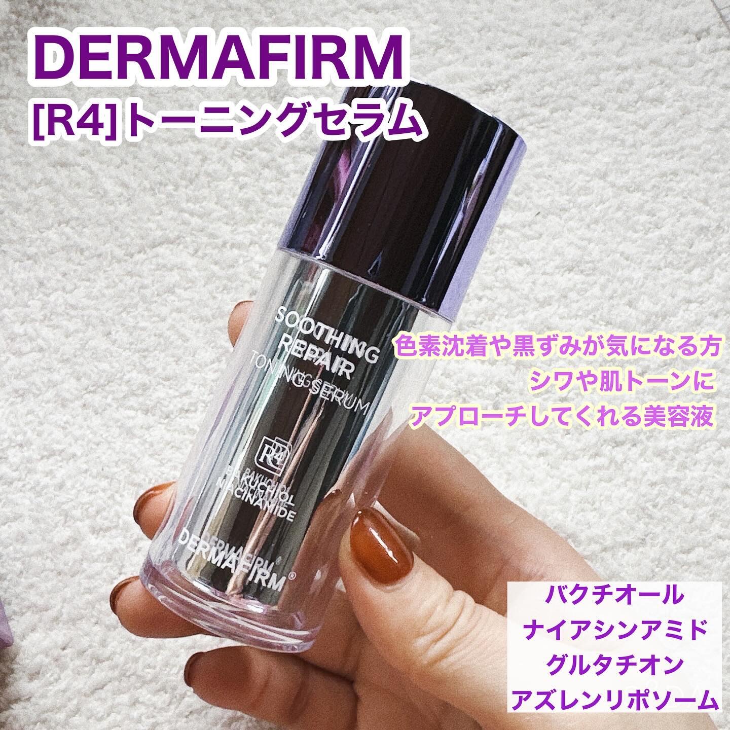 DermafirmSoothingRepairToningSerumR4 ダーマファームのトーニングセラムR4頂きました。こちらはバクチオールとナイアシンアミドとグルタチオン配合3色の肌悩みをまるごとマルチケア美容液。紫外線によって敏感になっ...