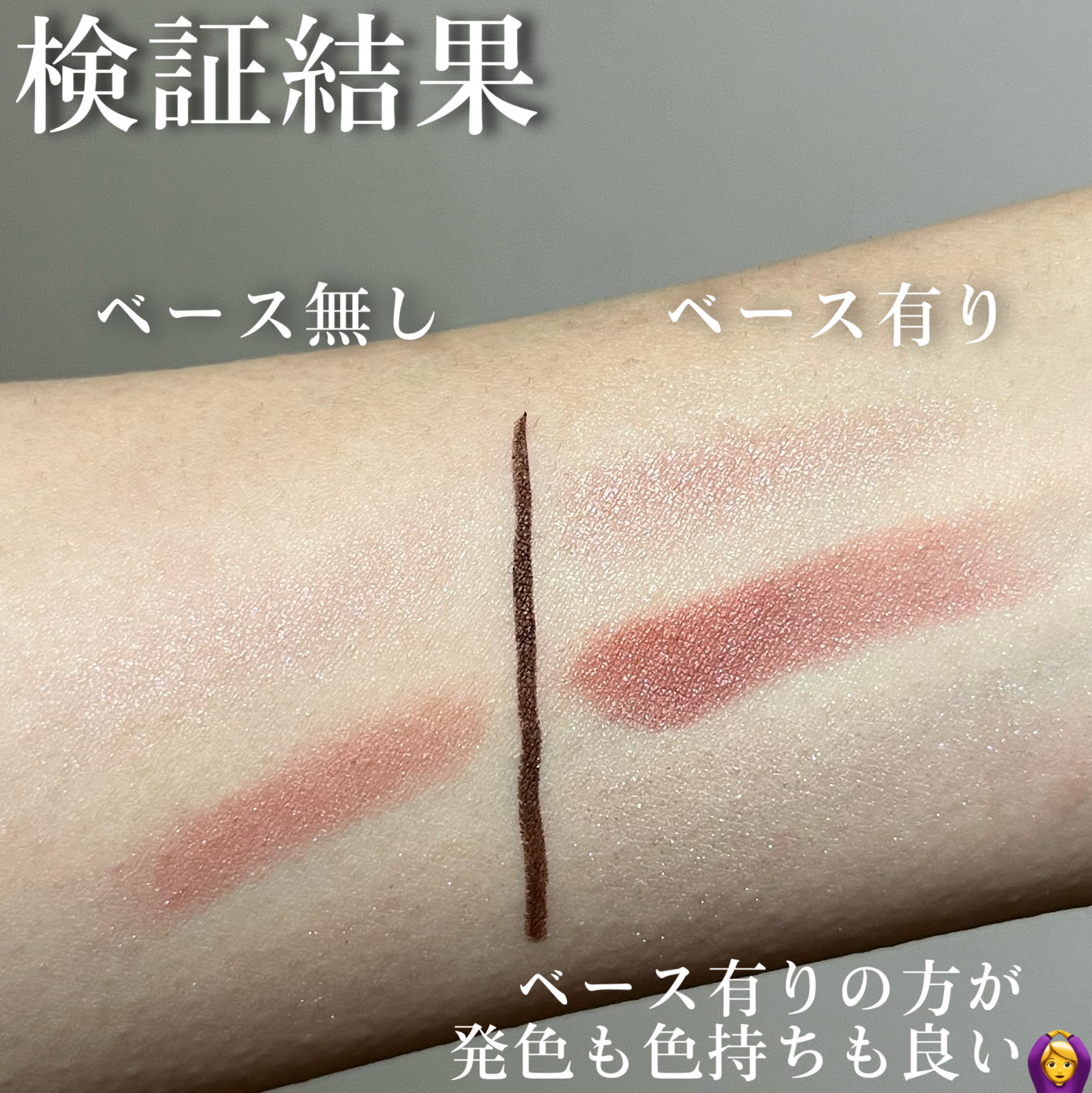 まぶたのくすみをカバーして、アイシャドウの発色&モチUP!! ベースメイク後、アイシャドウを塗る前(アイメイク前)に使います! アイシャドウベースを使う方が、アイシャドウの発色が良いです🙆♀️ 右側のベース有りの方が発色がよく、ラメも綺麗ですよね! アイシャドウベース無しでもメイクは成り立つので、必須ではありません。 それでもアイシャドウベース有りの方が発色がよく、モチもいいです! アイシャドウベース、個人的にはメイクに慣れてきてレベルアップしたい方、メイクの幅を広げたい方におすすめです!