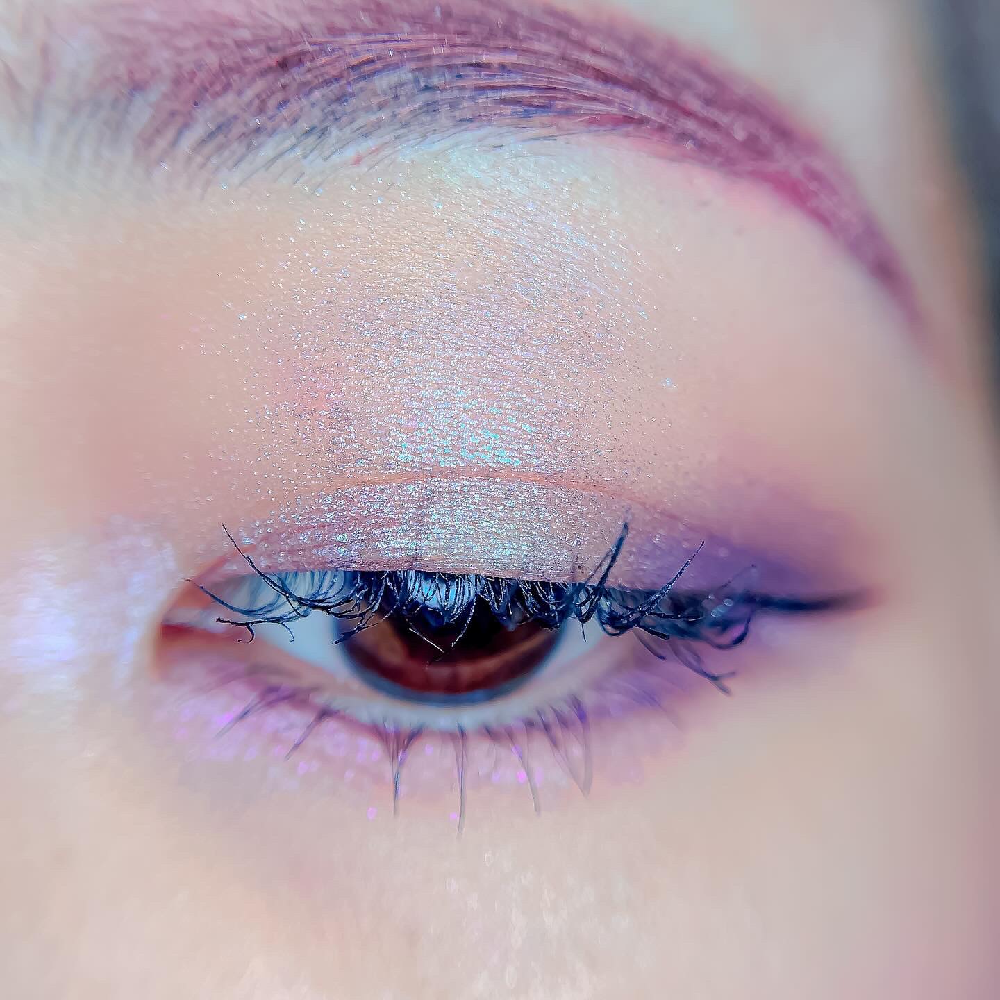 ベースに右上、目頭から黒目上に真ん中、黒目〜目尻に右下を、左上を目頭にくの字に塗ってもらいました✨ ピンクサクラよりもクールな感じで、目で見た色より私の肌では紫っぽく発色しました😍 上2つはラメはぎっしりでときめく💓 ブラウンメイクがとても苦手だけれどこれならブラウンメイク出来そう👌(かなり紫寄りですが) くすみ感は強いので苦手な方は厳しいかも…(特に真ん中) クールな印象になるので大人顔さん向けor大人顔になりたい方向けのイメージです✨