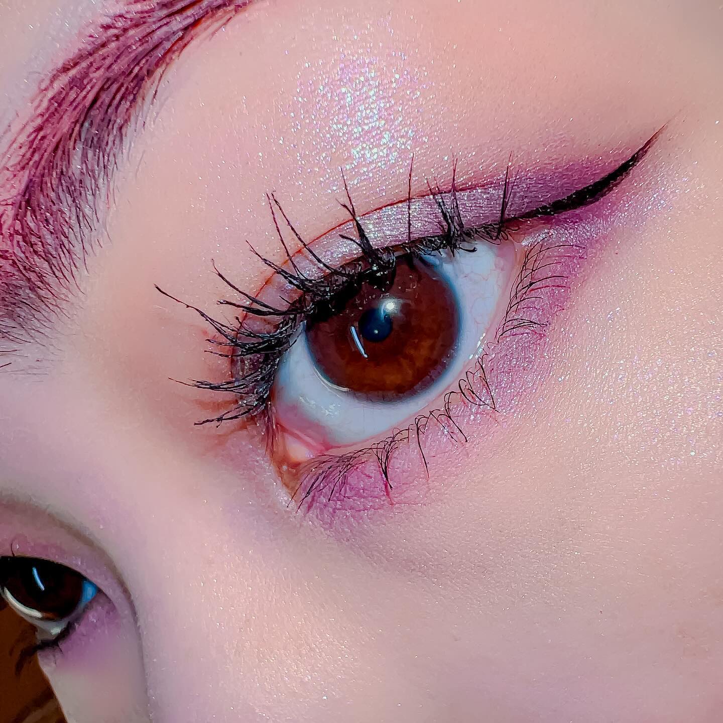 ピンクにグレージュも良いですね👌💗 今日は可愛らしい感じにしてみました💕 上下瞼黒目〜目頭側にラメを塗ってキラキラさせております🤩 目尻はマットのピンクを濃いめに重ねて💗 グレージュのアイライナーと相性◎