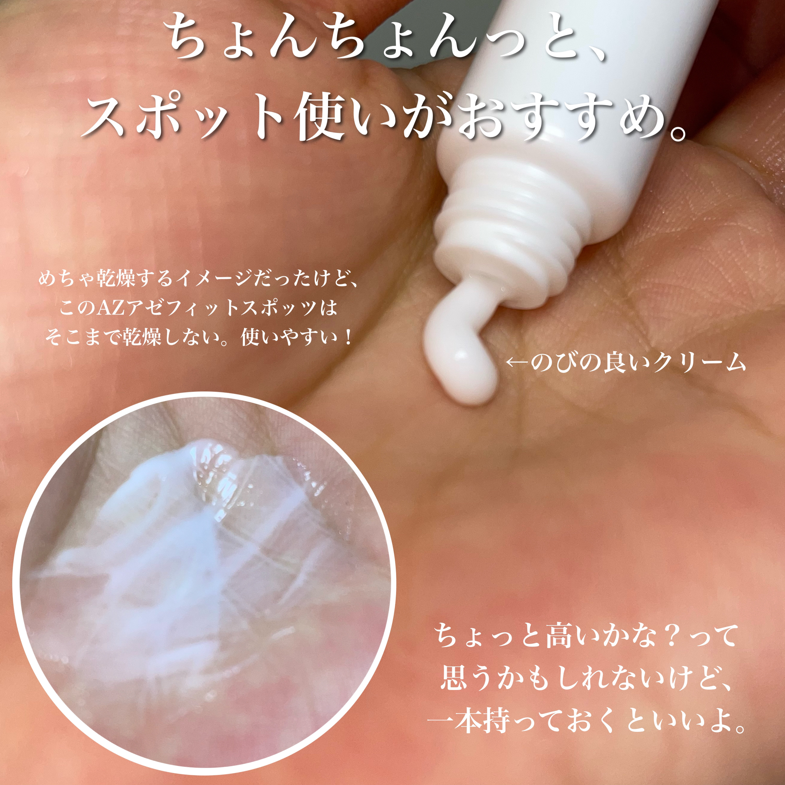 今話題のアゼライン酸*を20%と高濃度配合したクリームです。古い角質を柔らかくして毛穴づまりを防ぎながら肌トラブルを防ぎお肌を健やかに保ってくれますよ。 洗顔後最初に使います。乳白色のなめらかなクリーム、肌なじみ良くしっとりとした使い心地です。 AZシリーズ、他のアイテムもたくさんあるので気になります!