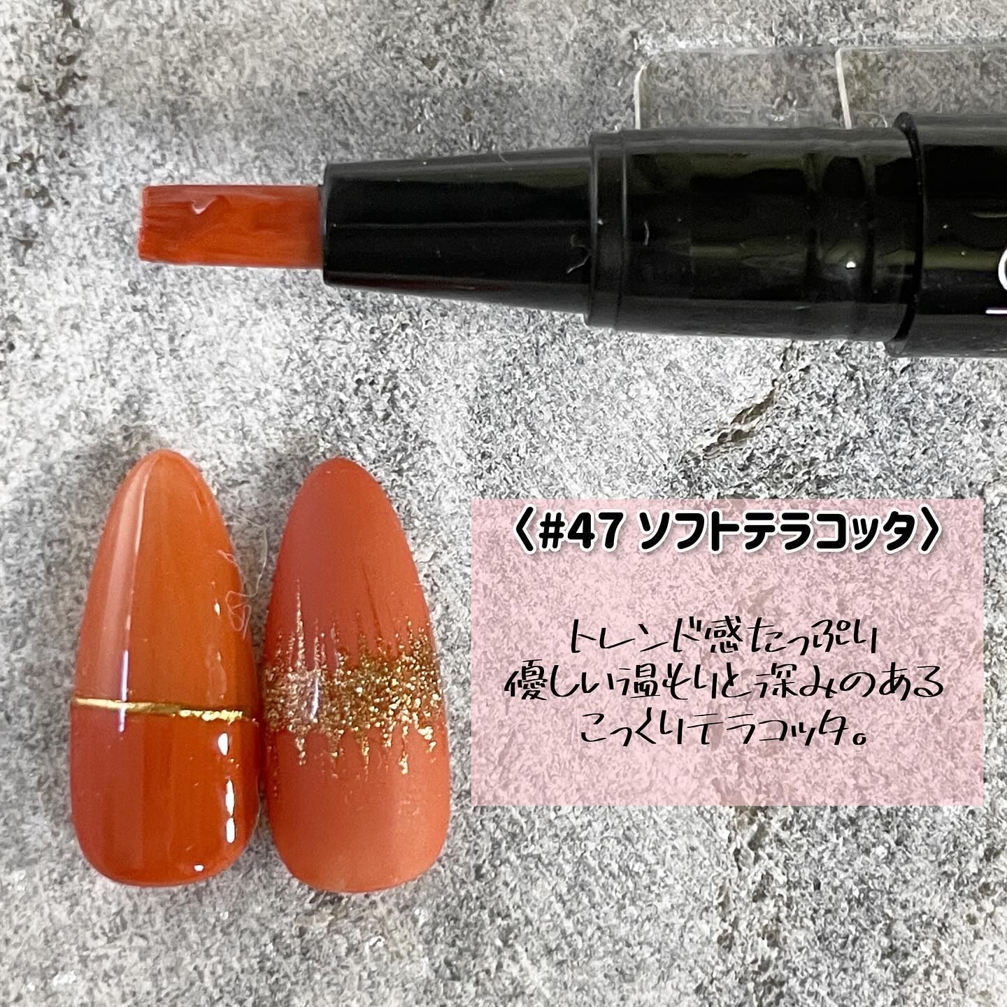 - 「ベース」「カラー」「トップ」の3つの役割を1本で果たす、便利なオールインワンジェル。ペンのような感覚で持つことができ自爪も塗りやすく、収納もコンパクト。リムーバー無しで剥がしてオフできるからその日だけネイルにもぴったりです。さらに特有の嫌なニオイがほとんどなく、パラベンやタルクなども処方されていません。誰でもネイルを楽しめます。