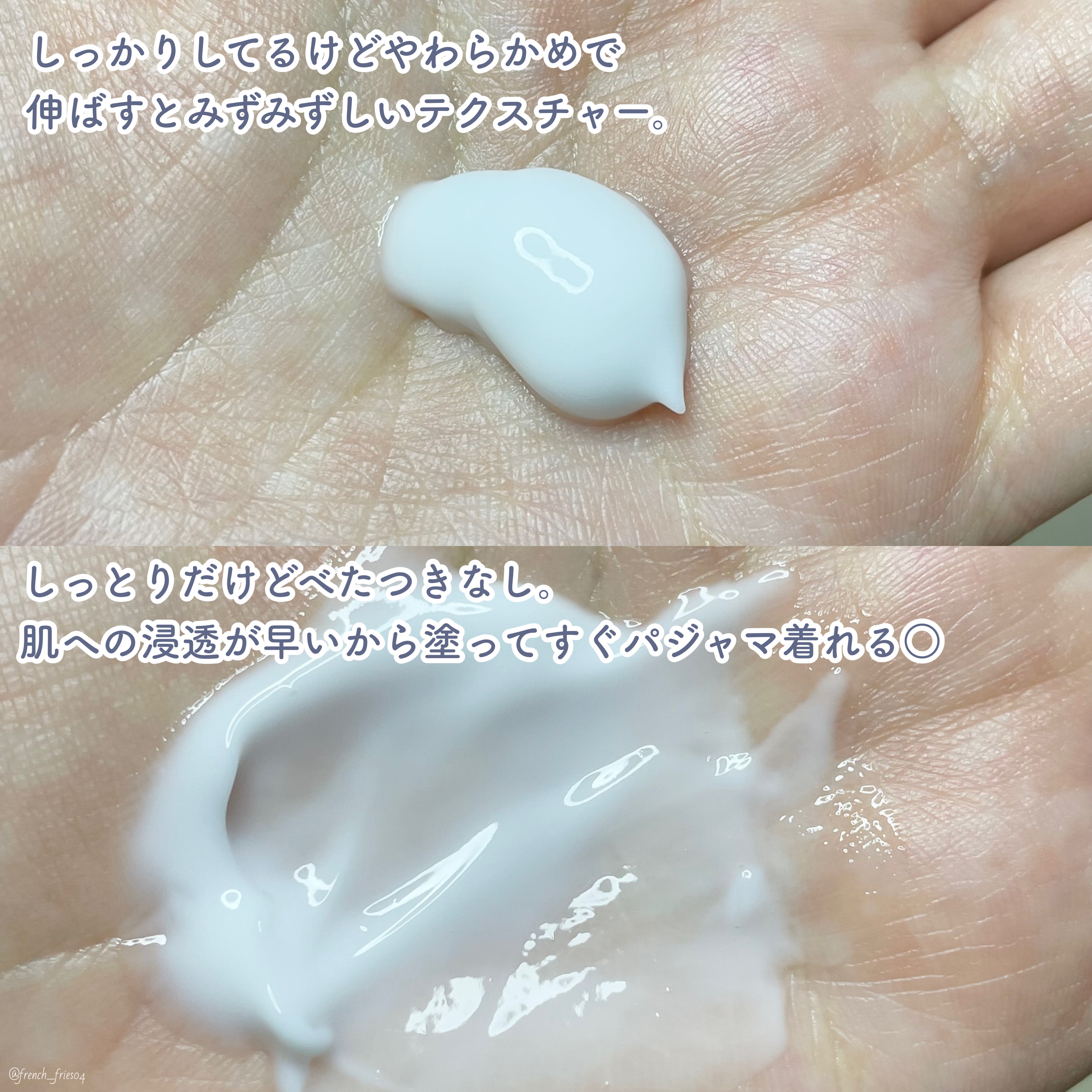 なめらかなテクスチャーでするする塗れます。 乾燥するとむずむずかゆくなりがちなので、潤い感じるテクスチャーなのに重くないつけ心地がとっても気に入りました。 かさつきが気になる肘や膝にたっぷり塗ってもベタベタしないのもいいです。 無香料で男女問わず使いやすいと思います。プッシュ式でさっと塗れるので、主人も気に入って一緒に使ってます。