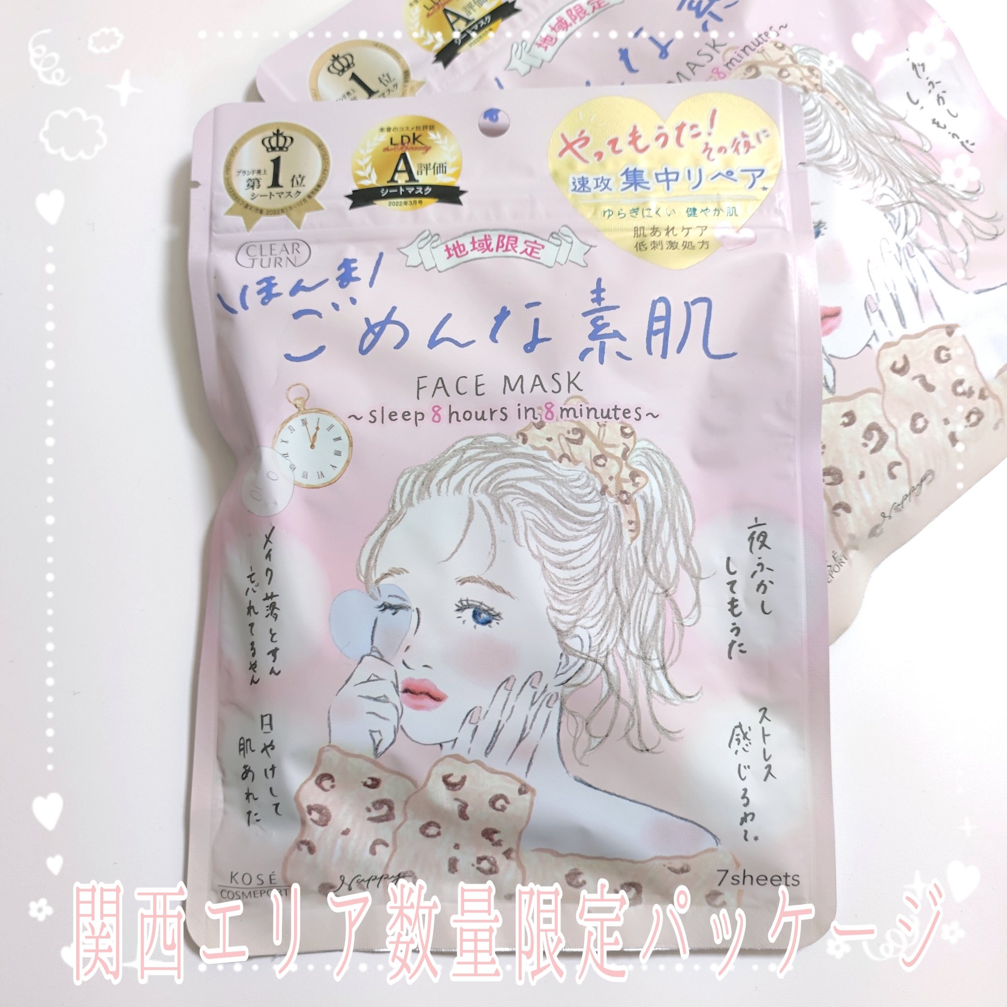 - 【クリアターン ごめんね素肌マスク】 負担をかけて、あれてしまった肌の素肌環境※1をととのえる“速攻集中リペア※2マスク”です。 ① あれがちな肌を素早くコンディションケア! ザクロエキス、桜エキス※3、ウメ果実エキスBG配合し、ゆらぎやすい肌環境をととのえ、肌あれをケアします。また、うるおいケア成分として、ヒアルロン酸、白キクラゲ多糖体BGを配合。外的ストレス※4や不規則な生活の影響を受けやすい肌も健やかでゆらぎにくい肌へみちびきます。 ②敏感肌も使える、弱酸性・低刺激処方 無香料・無着色・無鉱物油・アルコールフリー(エチルアルコール)・パラベンフリー・紫外線吸収剤フリー・シリコーンフリー・パッチテスト済み・アレルギーテスト済み・スティンギングテスト済み・敏感肌自覚者による連用テスト済み(すべての方にアレルギーや皮膚刺激が起きない、刺激感がないというわけではありません。すべての方の肌に合うということではありません。) ③角質ケアもできる!凸凹高密着シート コットン生まれのやわらかな肌触りのベンリーゼを使用。 表面に凸凹のエンボス加工を施しているため、密着性が高く、はがしたマスクでやさしく顔をふきとることで角質ケアもできます。 ※1 うるおい環境のこと ※2 うるおいお手入れのこと ※3 ソメイヨシノ葉エキス、ウメ果実エキスBGはウメ果実エキス・BG(保湿) ※4 乾燥による刺激のこと