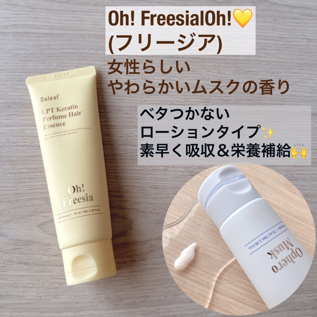 濡れた髪、乾いた髪にも使用可能な洗い流さないクリームタイプのトリートメント💜持ち歩きにも良さそうなサイズ感✨ LPP(低分子)、PPT(高分子)の二重タンパク質でダメージヘアをケアしてくれるよ🙆🏻♀️ ブランド香水のような良い香りがセットに♡ クリームミストなのにベタつきにくくて、髪がまとまりやすい⭐️ 私は特に毛先のダメージが気になるから近くで吹きかけてクリームタイプで、髪全体にはミストタイプで使って使い分けているよ🙆🏻♀️ 私のお気に入りの香りはPink BreezeとBlooming Rose 💕 Pink Breezeは可愛いらしい上品なフローラルの香り、Blooming Roseは花束のようなフローラルの良い香り♡ その日の気分で選べるのって魅力的だよね!
