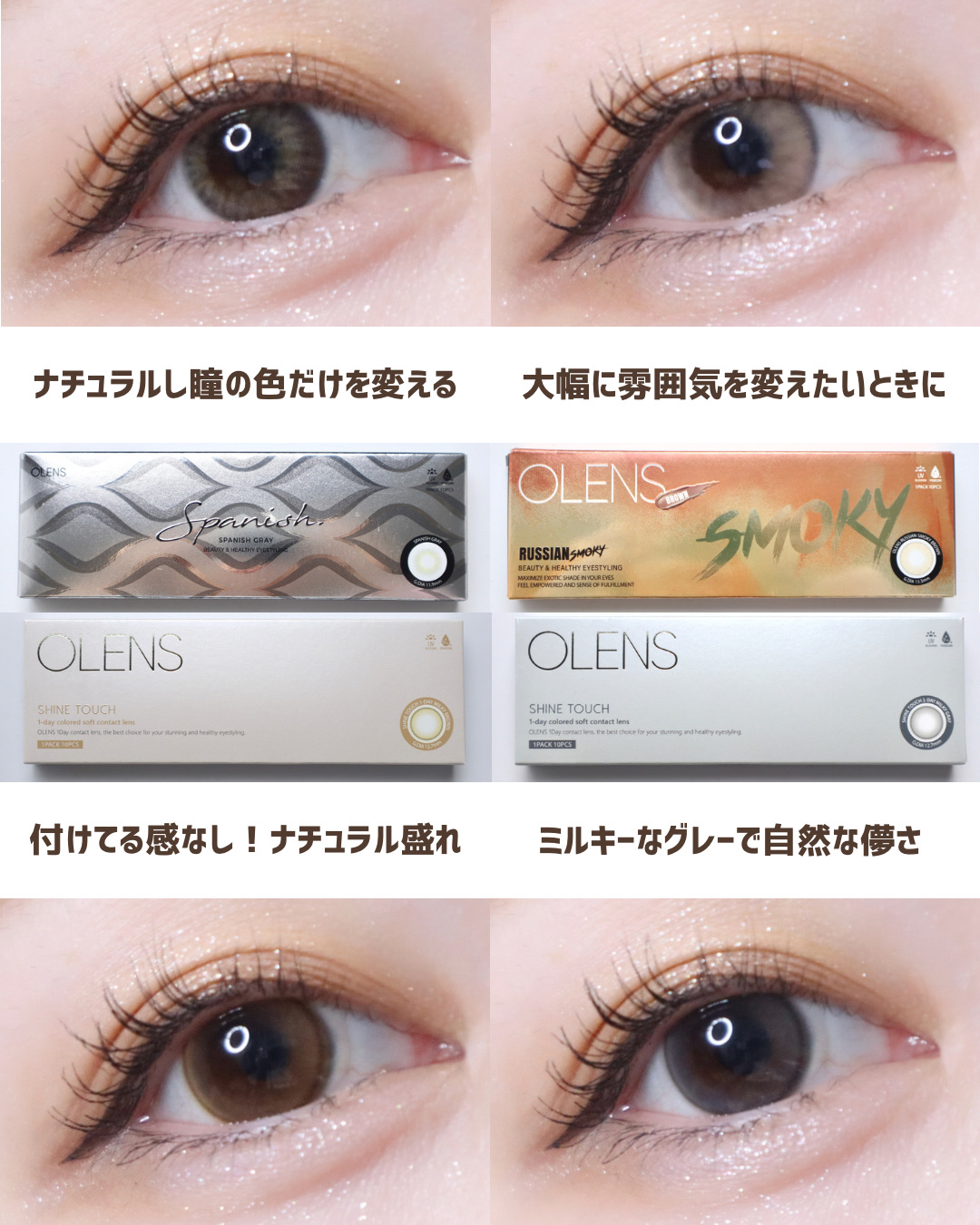 韓国No.1カラコン専門ブランド OLENS (@olens_official) のカラコンを4種比較! 明るめの虹彩カラコンで、抜け感+透明感を出してくれる淡いカラー✨ 着色直径13.3mm×フチありデザインで、ロシアンスモーキーよりもさらに目元の印象をハッキリさせてくれるデザイン!