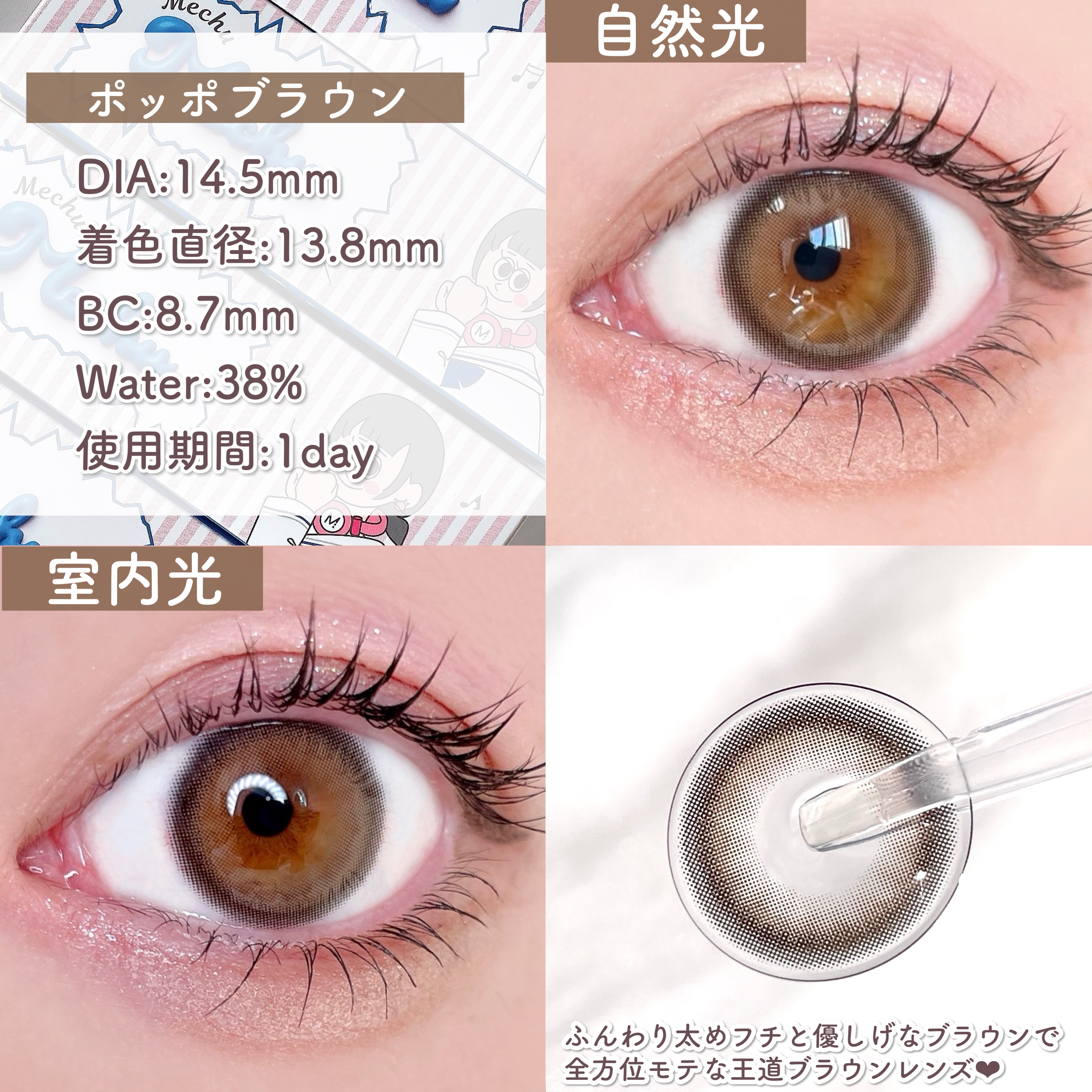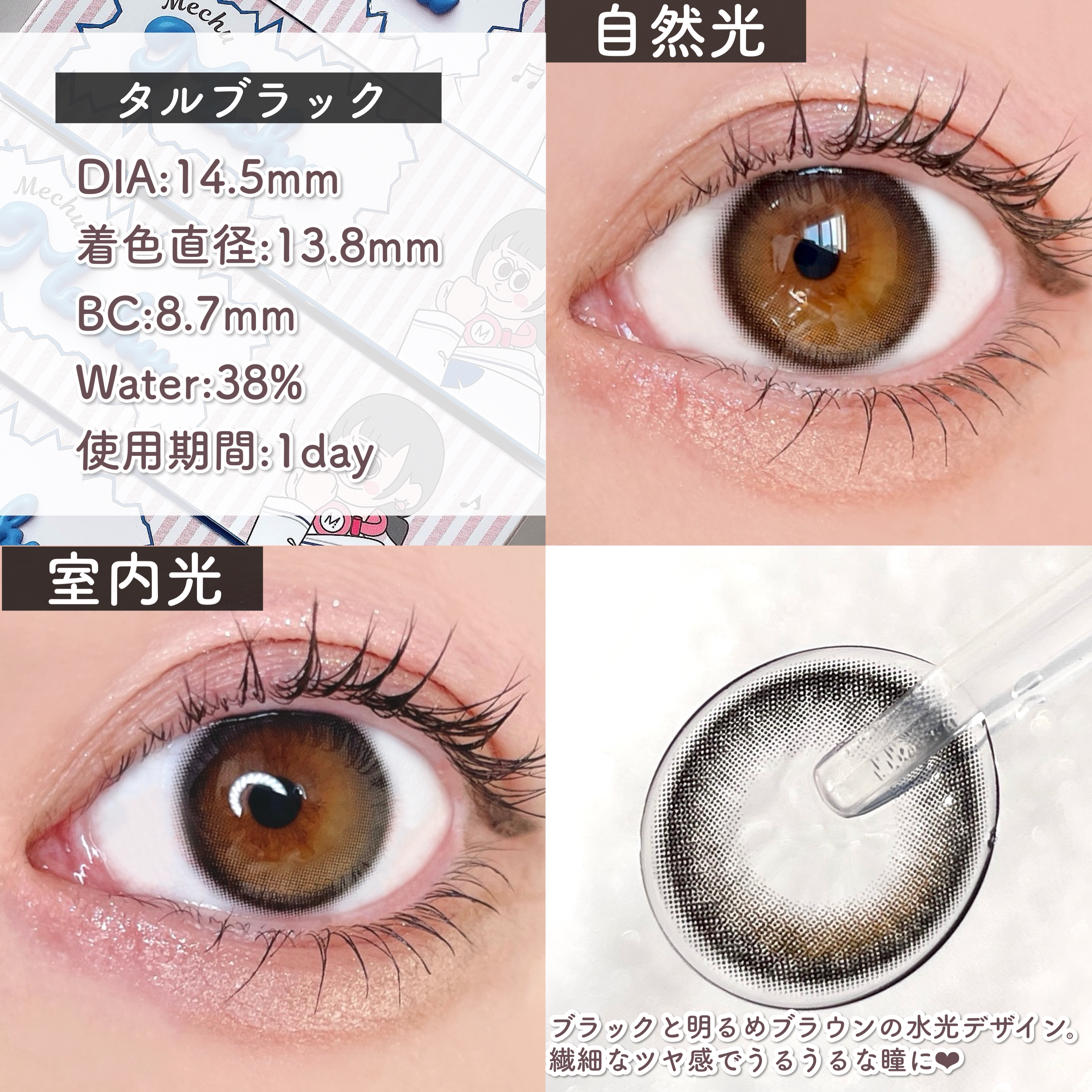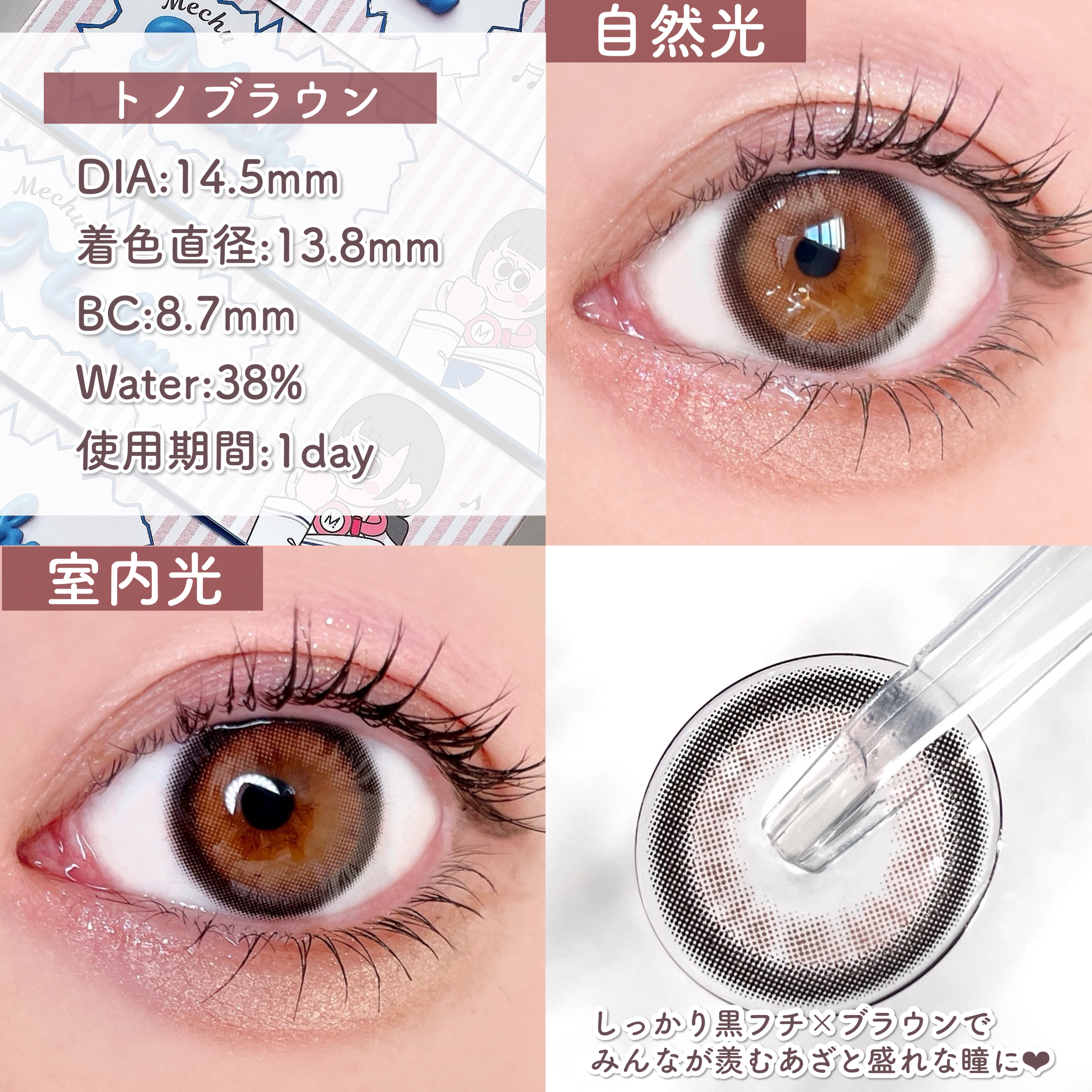 🩷MechuMechu-ミチュミチュ-⊹࣪˖┈┈˖࣪⊹┈┈⊹࣪˖┈┈˖࣪⊹┈┈⊹࣪˖┈┈˖࣪⊹◇スペック(全色共通)DIA14.5mm着色直径13.8mmBC8.7mm含水率38%1day(一箱10枚入り)Mizukiちゃんプロデュースのカラ...