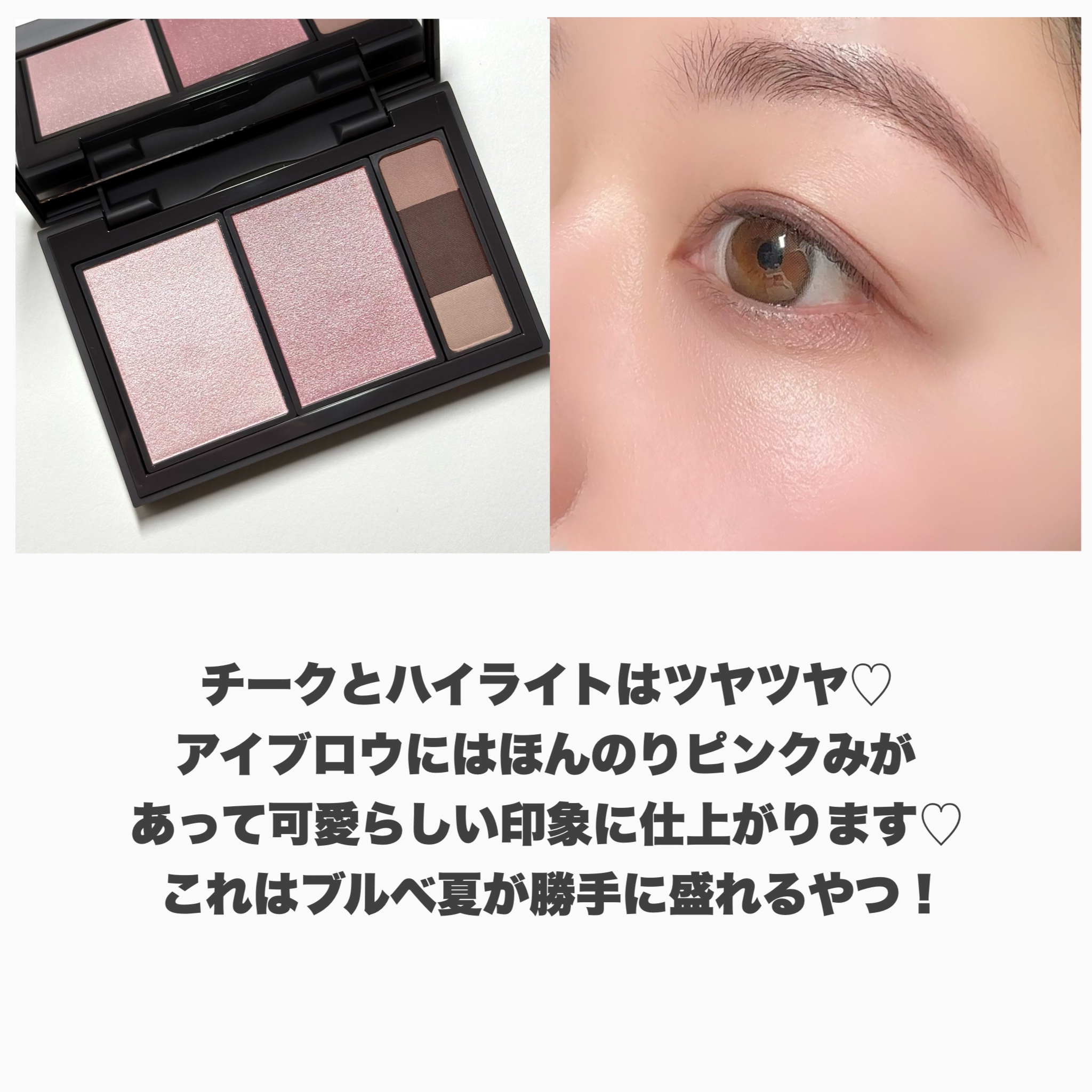 こちらはパーソナルカラーや使いたいカラー別で4種類のパレットがあり、今回はグレイッシュを持った柔らかなピンクトーンの02summer。 ハイライト、チークは質感が似ていて、ツヤと上品な煌めきを感じる仕上がり。 サマー向けと言われていたり、ピンクと名のついたパレットってコーラルピンクっぽい感じが多いイメージだったのですが、こちらはちゃんと黄みの少ないピンクなのが個人的に好きなポイント。