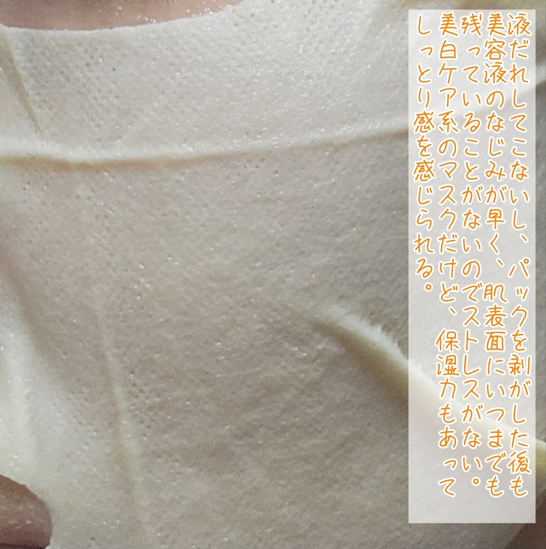 ビタミンC誘導体が一枚にたっぷり!刺激を減らしたビタミンをお肌ヘチャージ! 高含有量ビタミンC誘導体(アスコビックシード)がメラニン生成酵素の活性を抑制 使用中少し刺激を感じたかも…剥がしたあとお肌がツヤっとしてる所は良かったですがべたつきがあったのと、香りがキツすぎて呼吸がつらく早く剥がしたくなりました。