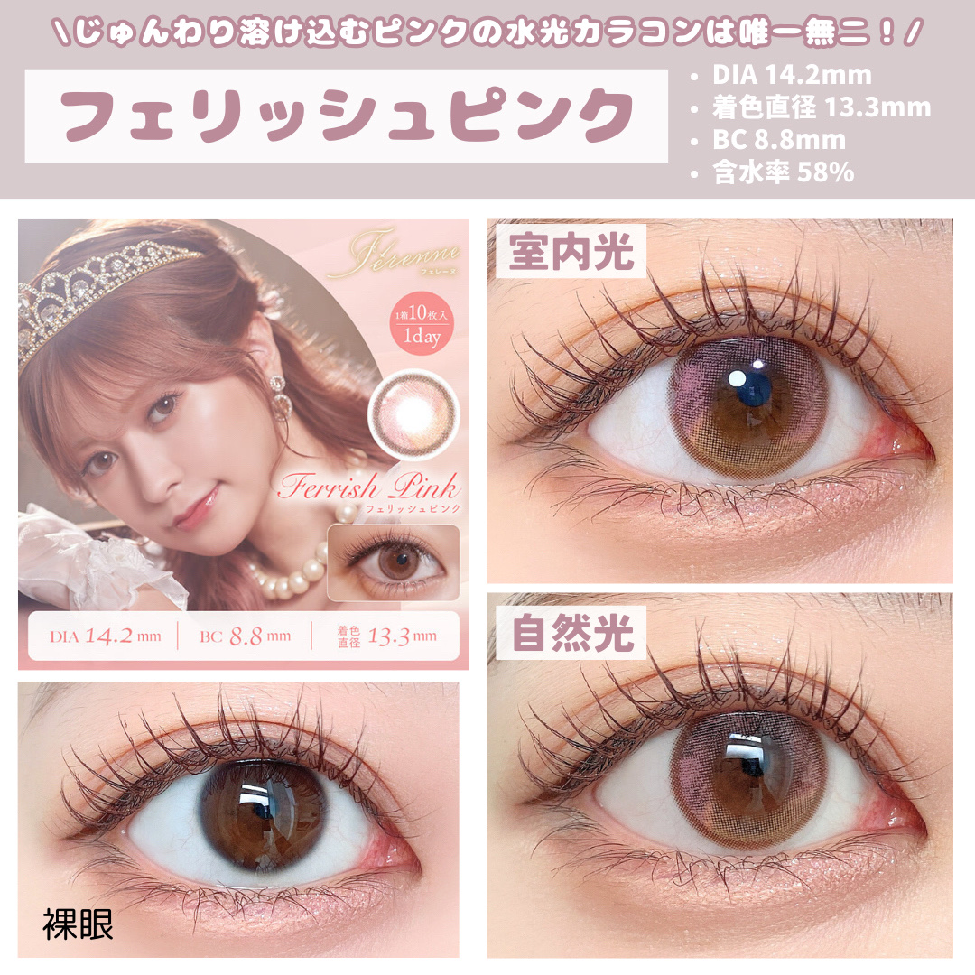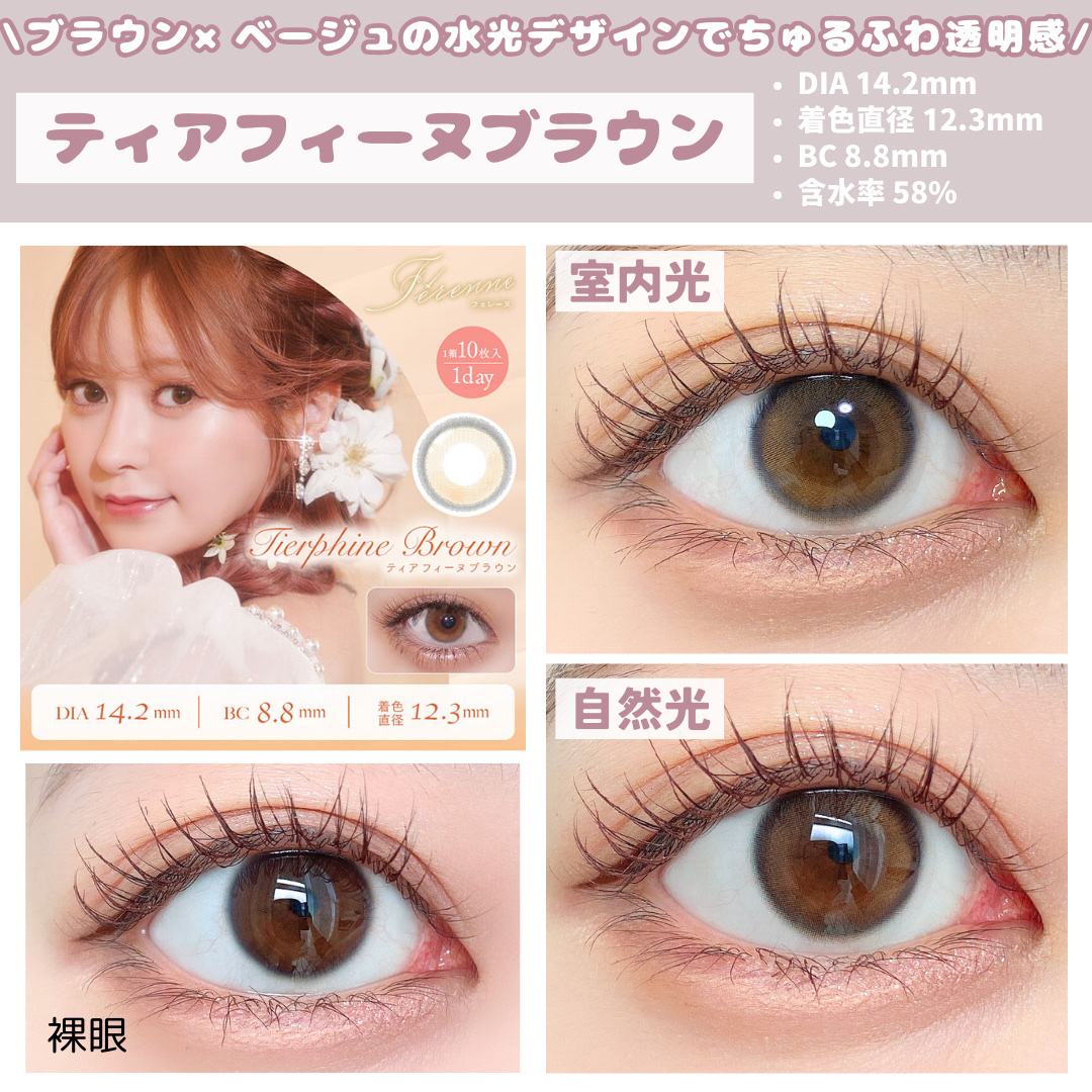 - ■Eccrine Brown(エクリンブラウン) DIA:14.2mm/着色外径:13.3mm ちゅるんとした魅力的な瞳を演出。 ブラウンとライトベージュが瞳に艶感を出す水光レンズ。 ■Charme Gray(シャルムグレー) DIA:14.2mm/着色外径:12.7mm 大人可愛いダークグレーがポイント。 細めのくっきりフチが瞳に馴染み高貴さを演出。 ■Tierphine Brown(ティアフィーヌブラウン) DIA:14.2mm/着色外径:12.3mm 裸眼に溶け込むようになじみ、やわらかい印象を与えてくれる。 透明感溢れる可憐な瞳を演出 ■Ferrish Pink(フェリッシュピンク) DIA:14.2mm/着色外径:13.3mm 瞳に立体感と透明感をプラスしてくれるグラデーションレンズ。 瞳にじゅわっと溶け込むようになじみ、絶妙なこなれ感を演出してくれる。 コンタクトレンズの不適正使用による眼障害の危険性等などがあります。 ●コンタクトレンズは高度管理医療機器です。不十分な洗浄・消毒など不適切なケアや、長時間・交換期間を超えた装用により、アレルギー性結膜炎、角膜感染症、角膜潰瘍等の重篤な眼障害が発生する危険性があります ●ご使用前に取扱説明書を確認してください 使用上の留意事項 ●眼科医院等を受診してからお求めください ●眼に異常を感じたら直ちにレンズ使用を中止し、お近くの眼科等で診察を受けてください ●医師の指示にしたがってご使用ください ●コンタクトレンズを装用する場合、自覚症状がなくても、眼科医院等での定期検査を受けてください ●レンズに不具合がある場合は使用しないでください