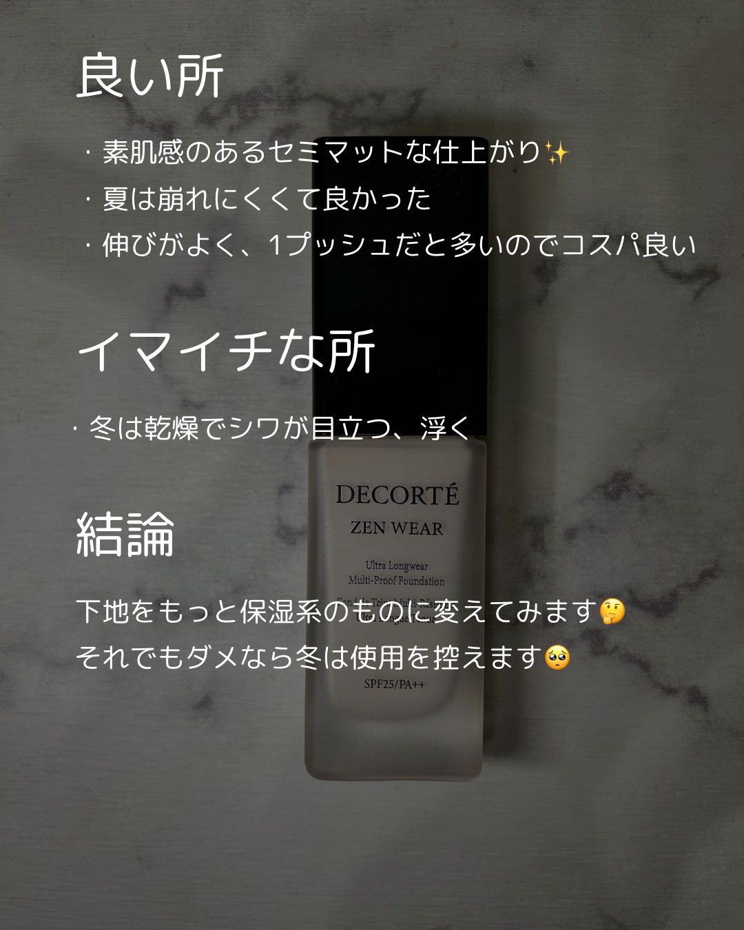 コスメデコルテゼンウェアフルイド30ml・7,150円エステでサンプルいただきました。普段は安いBBクリームを使っています。だいぶ前はリキッドファンデーション使ってました。こちらお値段高いだけあってすごく綺麗に仕上がります。手に取った時は柔ら...