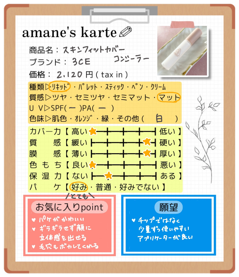 3CEスキンフィットカバーリキッドコンシーラーホワイト¥2,519--------------------------\もちもちリキッドコンシーラー/色も、質感も。素肌にピタッと馴染む。❥...神崎恵さんがおすすめで紹介していて、ちょうどホワ...