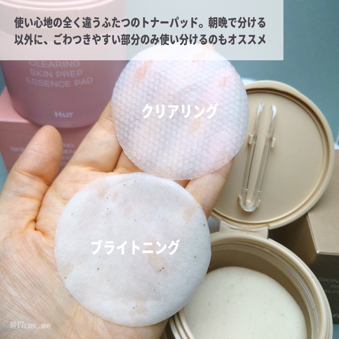 『クリアリング スキンプレップ エッセンスパッド』はAHA・BHA・PHA成分*¹ 配合のマイルドピーリング処方✍️エンボス加工されたセルロース素材のシートで朝の角質ケアにぴったりだったよ🙆♀️✨ 『ブライトニング スキンプレップ エッセンスパッド』はα-アルブチン*² や米エキス・緑豆エキス*³ などの整肌成分配合👌やや厚みのある無漂白の木綿純綿パッド素材!肌あたりが優しいのはこちらのパッド🤔 Morning routineには『クリアリング スキンプレップ エッセンスパッド』が好みで、Night routineには『ブライトニング スキンプレップ エッセンスパッド』がタイプでした◎