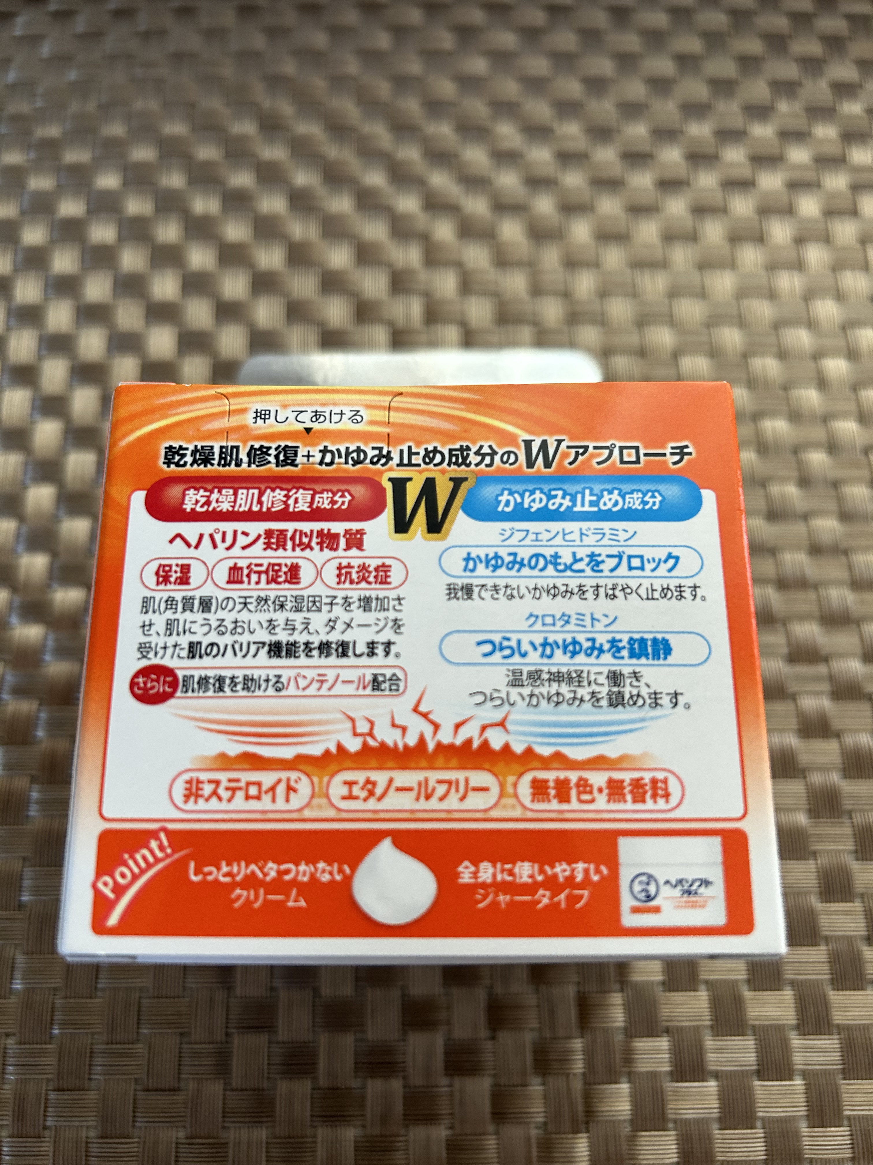 - かきむしって悪化させる前にお使いください。かき跡を修復しながらつらい乾燥状態の肌にしっかりと効いていく「かきむしり乾燥肌の治療薬」です。2つの乾燥肌修復成分(ヘパリン類似物質、パンテノール)、2つのかゆみ止め成分(クロタミトン、ジフェンヒドラミン)を配合。乾燥してあらわれる、かきむしりたくなる乾燥肌に効果を発揮します! 尿素無配合、非ステロイド。第2類医薬品