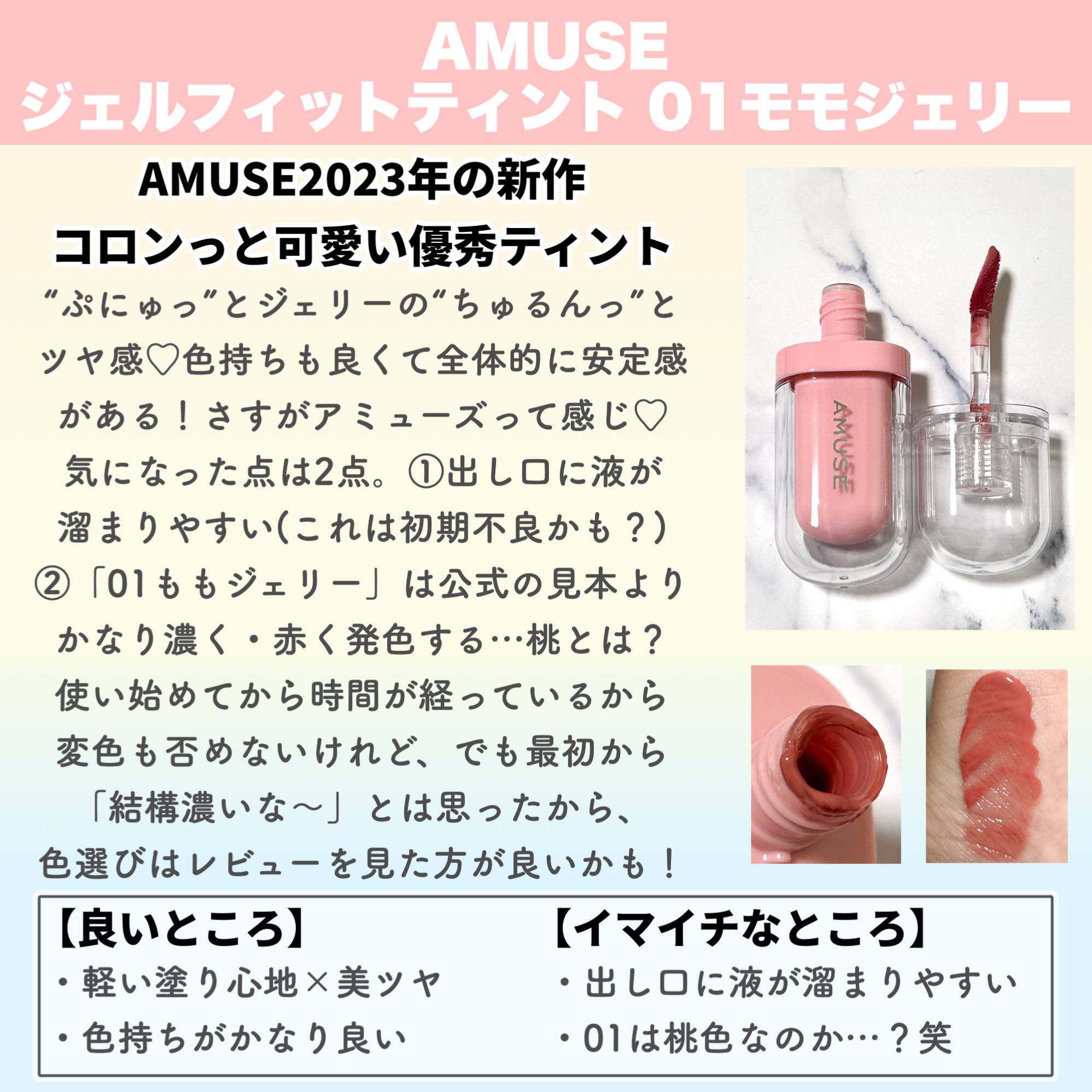 吉見さん、あけましておめでとうございます😊新年早々コメント失礼しますw いつも参考にさせてもらってます。 アミューズのモモジェリーのレビュー、私も同じこと思ってました。塗った直後はピンク?な感じしますが、ほぼ赤になりますよね😂一緒だーと思ったので、つい言いたくなりました🥺 長々とすみません💦 よいお年をー🫶💕✨