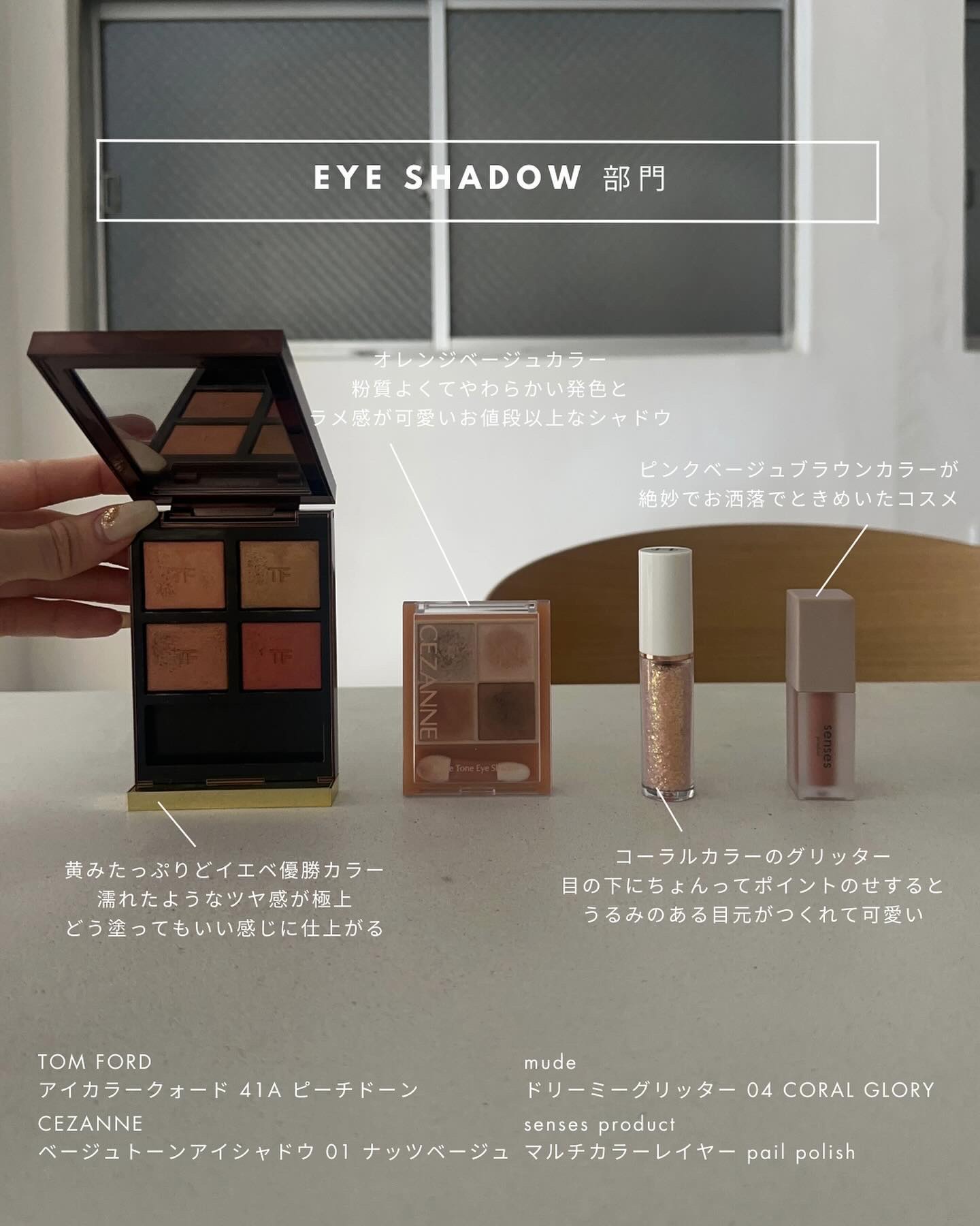 【 アイブロウ部門 】■セザンヌノーズ&アイブロウパウダー05 コーラルブラウン極細アイブロウマスカラC1 ピンクブラウン 【 アイシャドウ部門 】■スックシグニチャーカラーアイズ04 純撫子■フジコ足しパレ01 彫り深ウォーム■スアドールokheeNUN08 Under Eye Brush 【 マスカラ部門 】■ロムアンドハンオールフィックスマスカラL03 ロングヘーゼル■マジョリカマジョルカラッシュエキスパンダー ロングロングロングEXOR505 ヴィンテージオレンジ歩幅 【 ハイライト部門 】■クリオプリズム エアー ハイライター01 ゴールドシアー■アディクションザ ブラッシュ ニュアンサー002N ゴールデン エデン 【 リップ部門 】■ケイトリップモンスター■セルヴォークディグニファイドリップス09 テラコッタ■アディクションザマットリップリキッド019S ウォームアプリコット