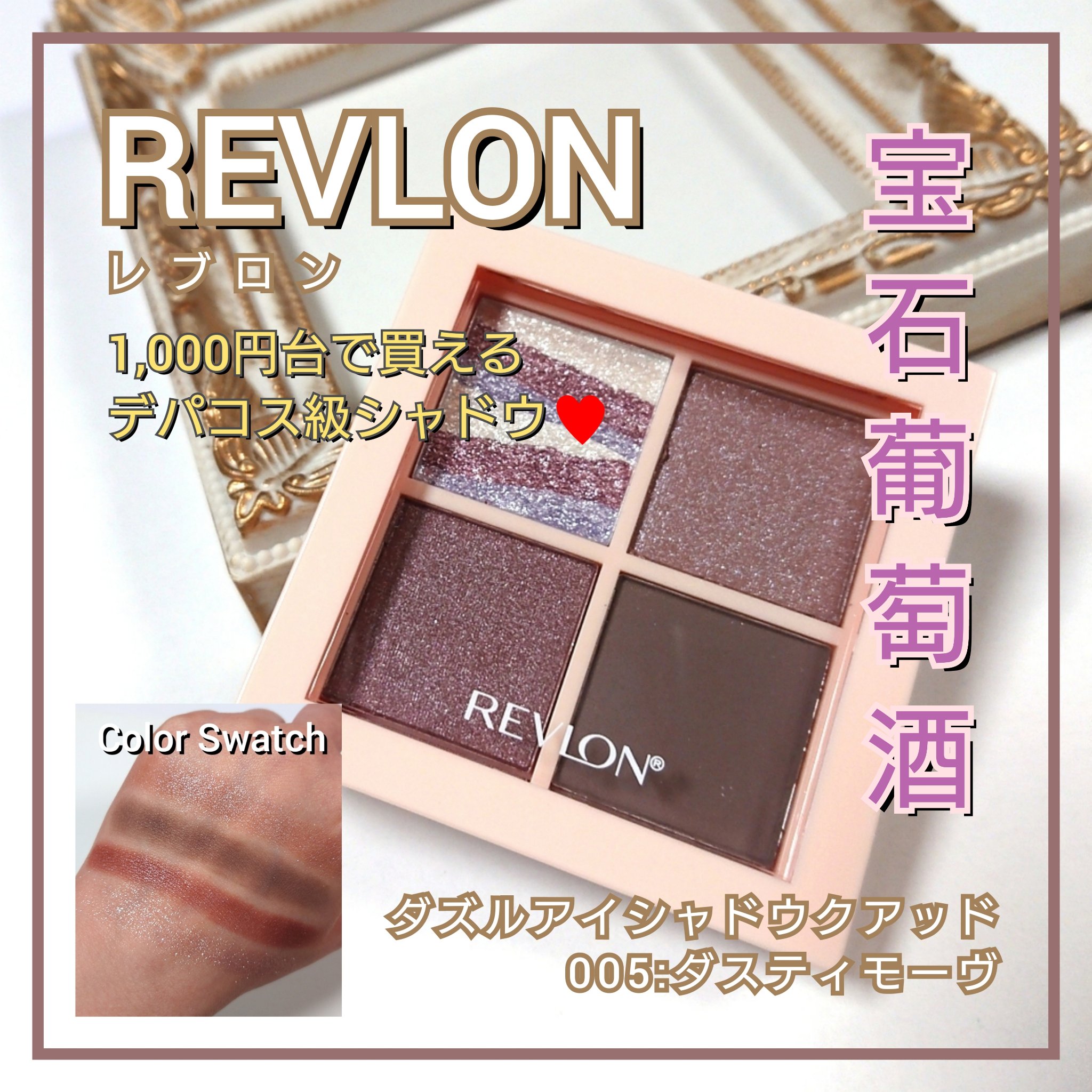 ぶどう🍇っぽいメイクがしたいんじゃぁぁあ!!という事で良いアイシャドウないかな〜とぶらぶらしてた時に理想的な色だなと思って買ってみた!【REVLONレブロンダズルアイシャドウクアッド003ヴィンテージローズ】¥1,540(税込)スウォッチ写真...