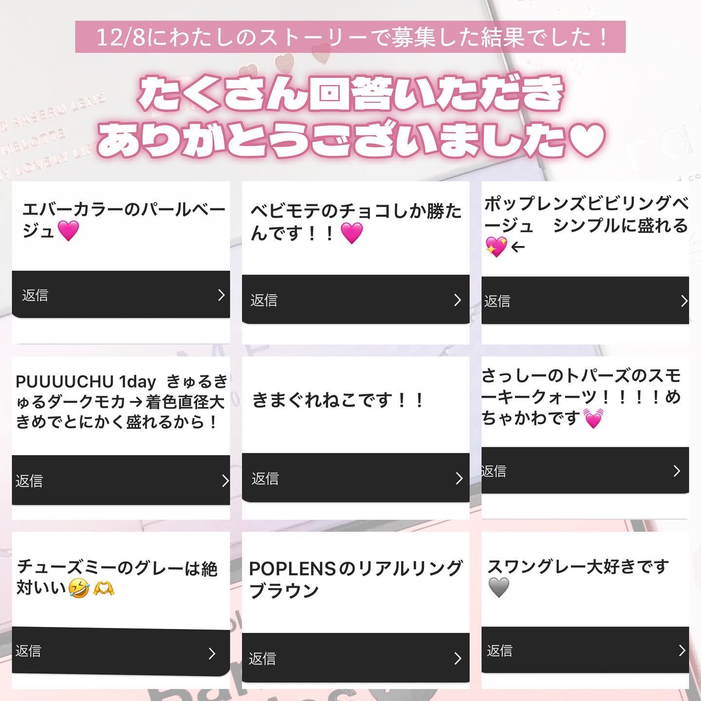 今年は特にグレーや青コンが豊作でみんなの推しもグレーが多めなのが新鮮でした🩶 特にスワンブルー、スノーブルーと回答してくださった方が多かったです! あとはもはや殿堂入りなパールベージュもめちゃくちゃ多かったです👏🏻