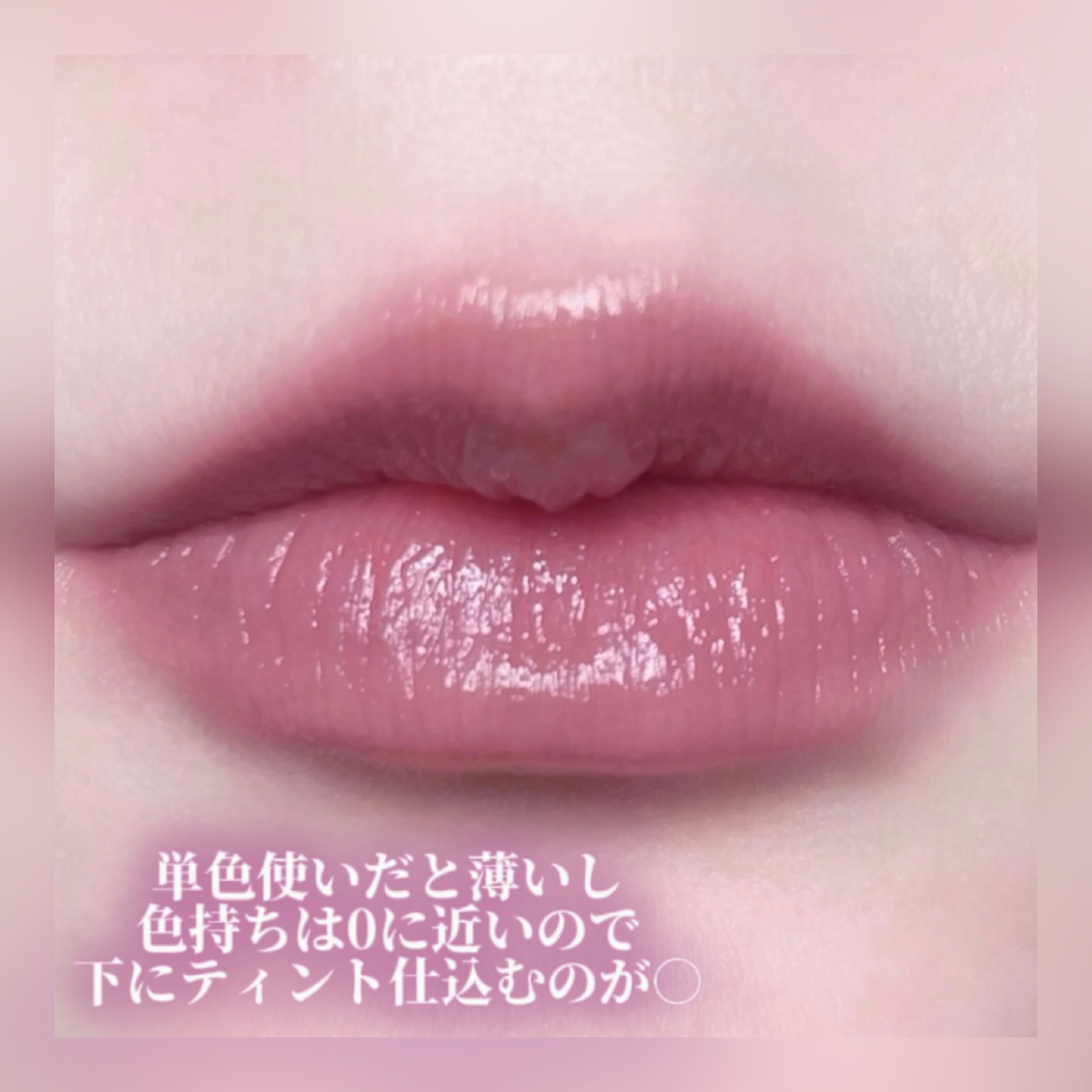 「落ちない」が前提のツヤ仕上げ ティントなのに素の唇が色づいたようなニュアンスカラー 潤いラップで唇の縦じわをカバーし、ぷっくりジェルコートされたようなもっちり×ツヤツヤな唇に 塗ってから1分くらい経つとツヤが増して徐々に唇に馴染むカラーになる気がする ティッシュオフすると赤っぽく色残りする感じがあるので、イエベさんもいけそうな香り ただティッシュでこすると割とすぐ色落ちちゃうし、最初のくすみピンクっぽさは無くなってしまうのが悲しい 1本で仕上げてもグロスを塗ったかのような仕上がり 色味が天才 色持ちはイマイチ 上積みのくすみピンクが取れると赤っぽい色残りになる