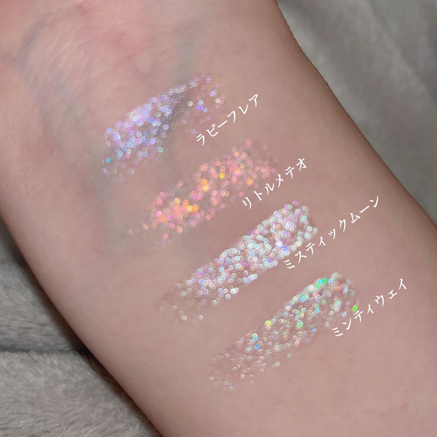 - <01 スターダスト(STARDUST)> 水、PET、ホ ウケイ酸(Ca/Al)、グリセリン、アクリレーツ コポリマー、ホウケイ酸( Ca/チタン)、1,2- ヘキサンジオール、(アク リル酸ヒドロキシエチル/ アクリロイルジメチルタウ リンNa)コポリマー、ス クワラン、AMP、エチル ヘキシルグリセリン、ポリ ソルベート60、イソステ アリン酸ソルビタン、トコ フェロール、カルボマー、酸化スズ、EDTA-2N a、フェノキシエタノール、銀、酸化チタン、(チタ ン/酸化チタン)焼結物、酸化鉄 <02 ローズスター(ROSE STAR)> 水、PET、ポリ ブチレンテレフタレート、ア クリレーツコポリマー、グリ セリン、ホウケイ酸(Ca/ Al)、(エチレン/VA) コポリマー、ホウケイ酸(C a/Na)、ホウケイ酸(C a/Al)、1,2-ヘキサ ンジオール、(アクリル酸ヒ ドロキシエチル/アクリロイ ルジメチルタウリンNa)コ ポリマー、スクワラン、AM P、エチルヘキシルグリセリ ン、シリカ、ポリソルベート 60、イソステアリン酸ソル ビタン、トコフェロール、カ ルボマー、EDTA-2Na、酸化スズ、フェノキシエタ ノール、酸化チタン、酸化鉄、マイカ 使用方法 <03 イブニングスター(EVENING STAR)> 水、PET、ポリ ブチレンテレフタレート、グ リセリン、アクリレーツコポ リマー、ホウケイ酸(Ca/ チタン)、(エチレン/VA )コポリマー、ホウケイ酸( Ca/Al)、1,2-ヘキ サンジオール、シリカ、(ア クリル酸ヒドロキシエチル/ アクリロイルジメチルタウリ ンNa)コポリマー、スクワ ラン、AMP、エチルヘキシ ルグリセリン、ポリソルベー ト60、イソステアリン酸ソ ルビタン、トコフェロール、カルボマー、EDTA-2N a、酸化スズ、フェノキシエ タノール、酸化鉄、酸化チタ ン、(チタン/酸化チタン) 焼結物 <04 フローズンスター(FROZEN STAR)> 水、PET、ポリ ブチレンテレフタレート、ア クリレーツコポリマー、グリ セリン、ホウケイ酸(Ca/ Al)、(エチレン/VA) コポリマー、1,2-ヘキサ ンジオール、(アクリル酸ヒ ドロキシエチル/アクリロイ ルジメチルタウリンNa)コ ポリマー、スクワラン、AM P、エチルヘキシルグリセリ ン、ホウケイ酸(Ca/チタ ン)、シリカ、ポリソルベー ト60、イソステアリン酸ソ ルビタン、トコフェロール、カルボマー、EDTA-2N a、酸化スズ、フェノキシエ タノール、酸化チタン、酸化 鉄、マイカ、(チタン/酸化 チタン)焼結物 <05 ラビーフレア(LOVEY FLARE)> 水、PET、ホウケイ酸(Ca/Al)、グリセリン、ホウケイ酸(Ca/チタン)、酸化チタン、アクリレーツコポリマー、PVP、1,2-ヘキサンジオール、シリカ、カルボマー、フェノキシエタノール、(アクリル酸ヒドロキシエチル/アクリロイルジメチルタウリンNa)コポリマー、スクワランAMP、エチルヘキシルグリセリン、酸化スズ、酸化鉄、EDTA-2Na、マイカ、ポリソルベート60、BG、ペンチレングリコール、ダイズ種子エキス、イソステアリン酸ソルビタン、アセチルグルコサミン、ヒアルロン酸Na、フナバラソウエキス、ヒドロキシアセトフェノン、オクタンジオール、タチアオイ花エキス、ヒアルロン酸クロスポリマーNa、トコフェロール、カプリリルグリコール <06 リトルメテオ(LTTLE METEOR)> 水、PET、ホウケイ酸(Ca/Al)、ホウケイ酸(Ca/チタン)、グリセリン、酸化チタン、アクリレーツコポリマー、PVP、1,2-ヘキサンジオール、シリカ、合成フルオロフロゴパイト、カルボマー、フェノキシエタノール、(アクリル酸ヒドロキシエチル/アクリロイルジメチルタウリンNa)コポリマー、スクワラン、AMP、エチルヘキシルグリセリン、酸化スズ、EDTA-2Na、ポリソルベート60、BG、ペンチレングリコール、ダイズ種子エキス、イソステアリン酸ソルビタン、アセチルグルコサミン、ヒアルロン酸Na、フナバラソウエキス、ヒドロキシアセトフェノン、オクタンジオール、タチアオイ花エキス、ヒアルロン酸クロスポリマーNa、トコフェロール、カプリリルグリコール <07 ミスティックムーン(MYSTIC MOON)> 水、PET、ホウケイ酸(Ca/Al)、グリセリン、ホウケイ酸(Ca/チタン)、酸化チタン、アクリレーツコポリマー、PVP、1,2-ヘキサンジオール、シリカ、カルボマー、フェノキシエタノール、(アクリル酸ヒドロキシエチル/アクリロイルジメチルタウリンNa)コポリマー、スクワラン、AMP、マイカ、エチルヘキシルグリセリン、酸化スズ、酸化鉄、EDTA-2Na、ポリソルベート60、BG、ペンチレングリコール、ダイズ種子エキス、イソステアリン酸ソルビタン、アセチルグルコサミン、ヒアルロン酸Na、コンジョウ、フナバラソウエキス、ヒドロキシアセトフェノン、オクタンジオール、タチアオイ花エキス、ヒアルロン酸クロスポリマーNa、トコフェロール、カプリリルグリコール <08 ミンティウェイ(MINTY WAY)> 水、PET、ホウケイ酸(Ca/Al)、グリセリン、酸化チタン、アクリレーツコポリマー、PVP、合成フルオロフロゴパイト、1,2-ヘキサンジオール、ホウケイ酸(Ca/チタン)、カルボマー、フェノキシエタノール、(アクリル酸ヒドロキシエチル/アクリロイルジメチルタウリンNa)コポリマー、シリカ、スクワラン、AMP、エチルヘキシルグリセリン、EDTA-2