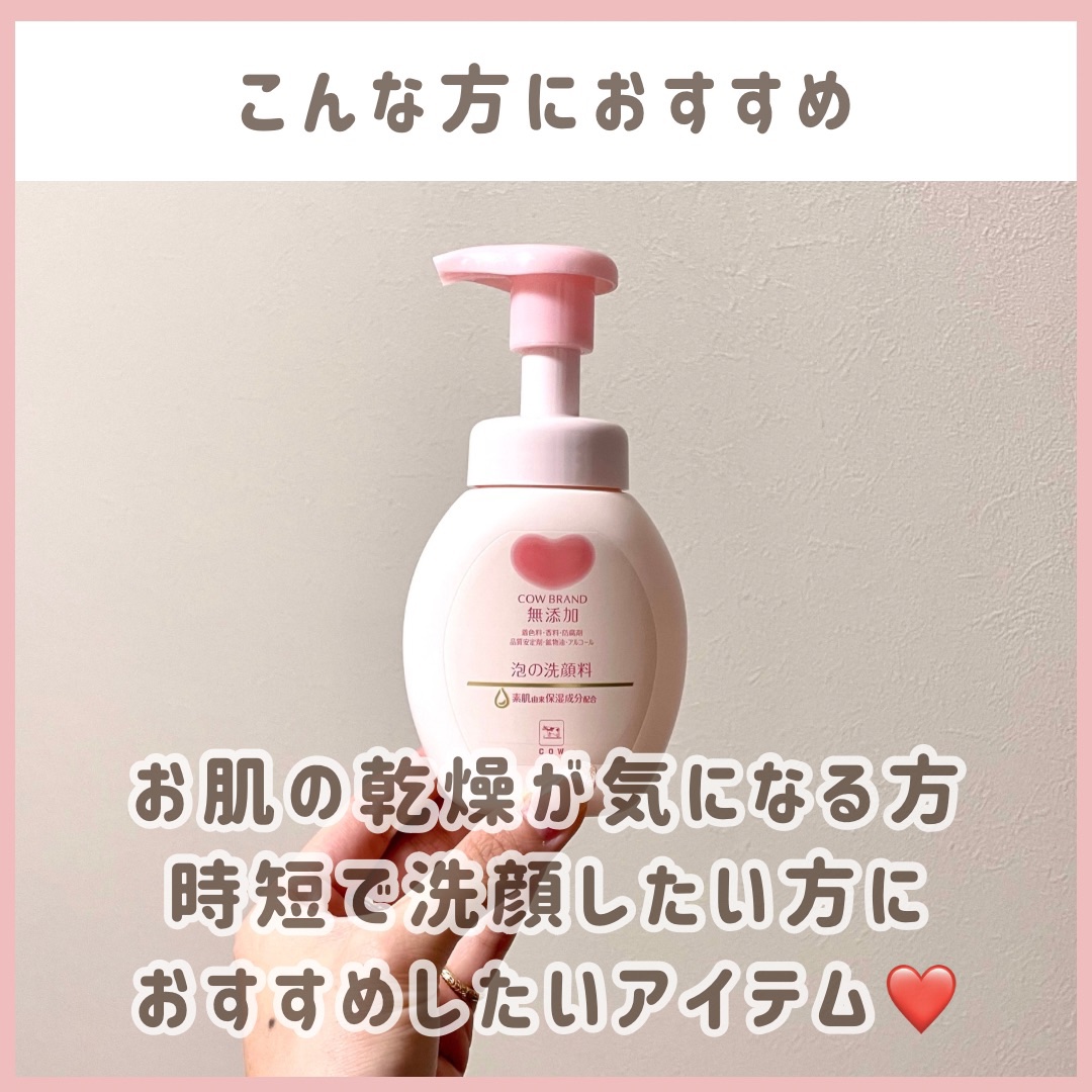 赤箱で有名な牛乳石鹸の会社から出ている「カウブランド無添加」のスキンケアシリーズ。 濃厚な泡がすぐ出てくるからとっても便利❤️ その上泡がきめ細かくてモッチリしているからクッションになって肌をこすらなくても洗顔できちゃうの🥰✨ 香料独特の原料の嫌なニオイがしないので匂いに敏感な方や妊娠中の方にも😌
