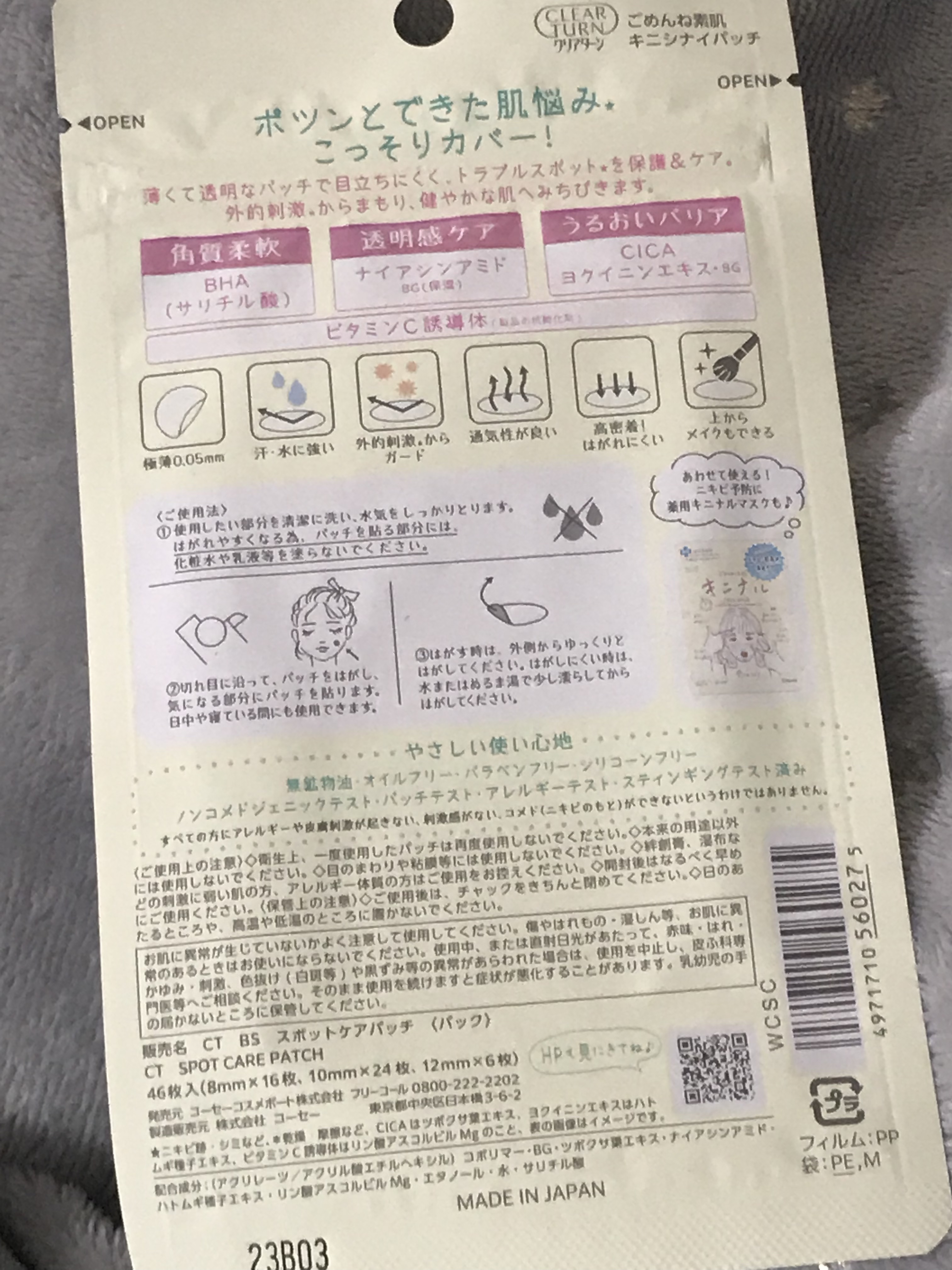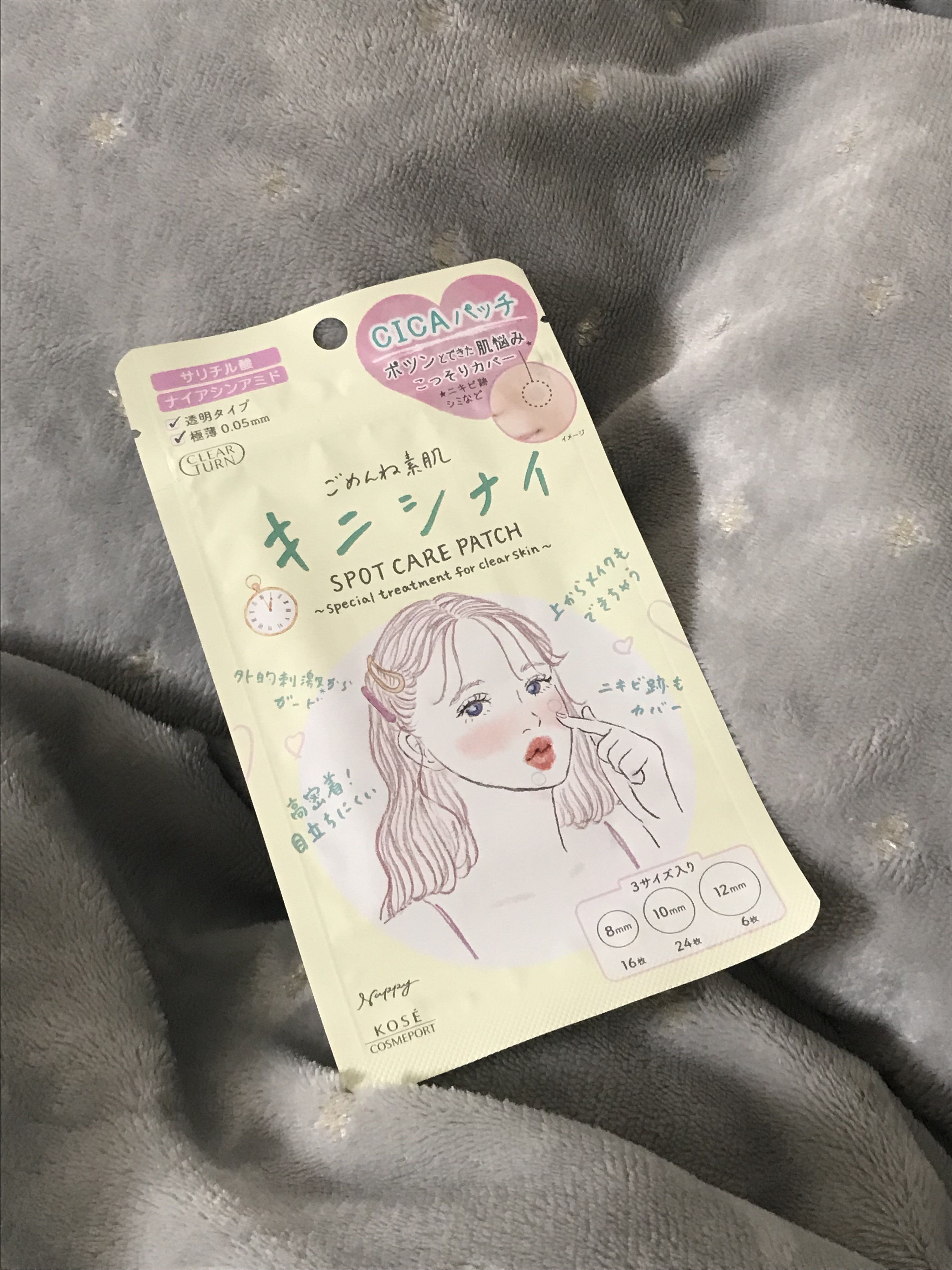 - ポツンとできた肌悩み※1をこっそりカバー! ①0.05mの超極薄パッチ 薄くて透明なパッチで目立ちにくく、トラブルスポット※1を保護&ケア。 外的刺激※2からまもり、健やかな肌へみちびきます。 ②キニナル部分を集中ケア 角質柔軟:BHA(サリチル酸) 透明感ケア:ナイアシンアミド・BG(保湿) うるおいバリア:CICA・ヨクイニンエキス・BG(保湿) ビタミンC誘導体(製品の抗酸化剤) ③肌悩みの大きさで選べる3サイズ。 大・中・小の3サイズが入っています。 ※1 ニキビ跡・シミなど ※2 乾燥・摩擦など CICAはツボクサ葉エキス、ヨクイニンエキスはハトムギ種子エキス、ビタミンC誘導体はリン酸アスコルビルMaのこと