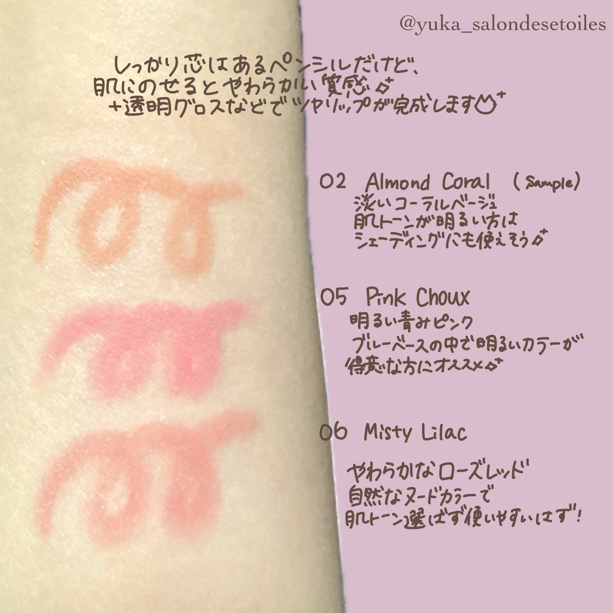 - <01 サンドベージュ> イソノナン酸イソノニル、水添ポリデセン、ジ(カプリル/カプリン酸)BG、シリカ、セレシン、(ビニルジメチコン/メチコンシルセスキオキサン)クロスポリマー、合成ワックス、ジメチコン、トリイソステアリン酸ポリグリセリル-2、合成フルオロフロゴパイト、セスキオレイン酸ソルビタン、ジメチコンクロスポリマー、ポリヒドロキシステアリン酸、酢酸トコフェロール、フェノキシエタノール、テトラ(ジ-t-ブチルヒドロキシヒドロケイヒ酸)ペンタエリスリチル、カニナバラ果実油、アンズ核油、酸化チタン、酸化鉄 <02 アーモンドコーラル> イソノナン酸イソノニル、水添ポリデセン、ジ(カプリル/カプリン酸)BG、シリカ、セレシン、(ビニルジメチコン/メチコンシルセスキオキサン)クロスポリマー、合成ワックス、トリイソステアリン酸ポリグリセリル-2、ジメチコン、セスキオレイン酸ソルビタン、ジメチコンクロスポリマー、ポリヒドロキシステアリン酸、合成フルオロフロゴパイト、酢酸トコフェロール、フェノキシエタノール、テトラ(ジ-t-ブチルヒドロキシヒドロケイヒ酸)ペンタエリスリチル、カニナバラ果実油、アンズ核油、酸化チタン、酸化鉄、赤104(1) <03 ピーチクリーム> イソノナン酸イソノニル、水添ポリデセン、ジ(カプリル/カプリン酸)BG、シリカ、セレシン、(ビニルジメチコン/メチコンシルセスキオキサン)クロスポリマー、合成ワックス、ジメチコン、トリイソステアリン酸ポリグリセリル-2、合成フルオロフロゴパイト、セスキオレイン酸ソルビタン、ジメチコンクロスポリマー、ポリヒドロキシステアリン酸、酢酸トコフェロール、フェノキシエタノール、テトラ(ジ-t-ブチルヒドロキシヒドロケイヒ酸)ペンタエリスリチル、カニナバラ果実油、アンズ核油、酸化チタン、酸化鉄、赤202、赤201 <04 サーモン> イソノナン酸イソノニル、水添ポリデセン、ジ(カプリル/カプリン酸)BG、シリカ、セレシン、(ビニルジメチコン/メチコンシルセスキオキサン)クロスポリマー、合成ワックス、ジメチコン、トリイソステアリン酸ポリグリセリル-2、合成フルオロフロゴパイト、セスキオレイン酸ソルビタン、ジメチコンクロスポリマー、ポリヒドロキシステアリン酸、酢酸トコフェロール、フェノキシエタノール、テトラ(ジ-t-ブチルヒドロキシヒドロケイヒ酸)ペンタエリスリチル、カニナバラ果実油、アンズ核油、酸化チタン、赤201、黄4、酸化鉄、赤104(1) <05 ピンクシュー> イソノナン酸イソノニル、水添ポリデセン、ジ(カプリル/カプリン酸)BG、シリカ、セレシン、(ビニルジメチコン/メチコンシルセスキオキサン)クロスポリマー、合成ワックス、ジメチコン、トリイソステアリン酸ポリグリセリル-2、セスキオレイン酸ソルビタン、合成フルオロフロゴパイト、ジメチコンクロスポリマー、ポリヒドロキシステアリン酸、酢酸トコフェロール、フェノキシエタノール、テトラ(ジ-t-ブチルヒドロキシヒドロケイヒ酸)ペンタエリスリチル、カニナバラ果実油、アンズ核油、酸化チタン、黄4、赤104(1)、赤202、赤201 <06 ミスティーライラック> イソノナン酸イソノニル、水添ポリデセン、ジ(カプリル/カプリン酸)BG、シリカ、セレシン、(ビニルジメチコン/メチコンシルセスキオキサン)クロスポリマー、合成ワックス、トリイソステアリン酸ポリグリセリル-2、ジメチコン、セスキオレイン酸ソルビタン、ジメチコンクロスポリマー、ポリヒドロキシステアリン酸、合成フルオロフロゴパイト、酢酸トコフェロール、フェノキシエタノール、テトラ(ジ-t-ブチルヒドロキシヒドロケイヒ酸)ペンタエリスリチル、カニナバラ果実油、アンズ核油、酸化チタン、赤104(1)、酸化鉄、黄4、青1 <07 ローズクリーム> イソノナン酸イソノニル、水添ポリデセン、ジ(カプリル/カプリン酸)BG、シリカ、セレシン、(ビニルジメチコン/メチコンシルセスキオキサン)クロスポリマー、トリイソステアリン酸ポリグリセリル-2、合成ワックス、ジメチコン、セスキオレイン酸ソルビタン、ジメチコンクロスポリマー、ポリヒドロキシステアリン酸、酢酸トコフェロール、フェノキシエタノール、合成フルオロフロゴパイト、テトラ(ジ-t-ブチルヒドロキシヒドロケイヒ酸)ペンタエリスリチル、カニナバラ果実油、アンズ核油、酸化チタン、赤104(1)、酸化鉄、黄4、青1 <08 オーバーピンク> イソノナン酸イソノニル、水添ポリデセン、ジ(カプリル/カプリン酸)BG、シリカ、セレシン、(ビニルジメチコン/メチコンシルセスキオキサン)クロスポリマー、合成ワックス、ジメチコン、トリイソステアリン酸ポリグリセリル-2、セスキオレイン酸ソルビタン、ジメチコンクロスポリマー、ポリヒドロキシステアリン酸、合成フルオロフロゴパイト、酢酸トコフェロール、フェノキシエタノール、テトラ(ジ-t-ブチルヒドロキシヒドロケイヒ酸)ペンタエリスリチル、カニナバラ果実油、アンズ核油、酸化チタン、酸化鉄、赤202 <09 コーラルクレープ> イ
