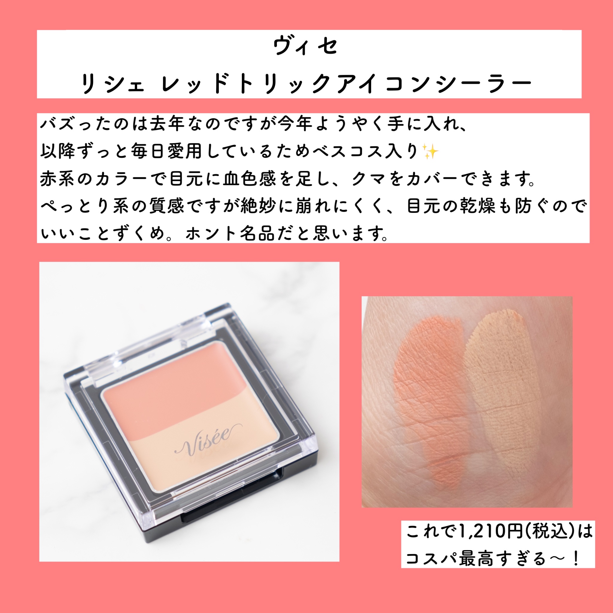 実際使ってみて、正直完全にクマが消えた!という感じはありませんでした。 でもそれは悪い意味ではなく、すごくナチュラルに目元が明るくできるなあという印象。 クマを完全に消し去りたい方はこれ1つだと難しいところがありますが、それでもこれでだいたい目のクマ、くすみはカバーできると思いましたし、私はこれで十分、普段使いするならコスパ超いいと思いました🥹 そしてこちら、美容液成分が配合されており、乾燥しにくいところも良いです‼️ 数時間経ったらドロドロと…いうこともなく、なかなかたくましくキープしてくれます。 プチプラコンシーラーはお気に入りのものがなかなか見つからないのですが、これは数回使ってすぐにお気に入りになりました! 一軍コスメとしてこれから愛用していきます♪
