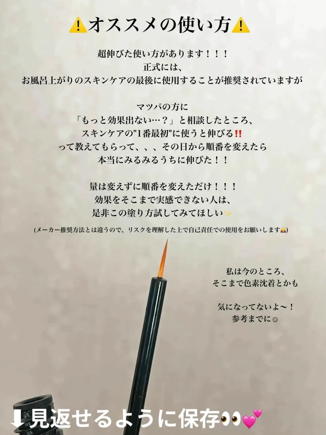 油分の少ないものから塗布していくよ。 使う順番が違うと効果が薄れちゃうこともあるから、スキンケアは正しい順番で行うことが大切💆♀️🤍 基本的な順番- 1.クレンジング 2.洗顔 3.まつ毛美容液 4.拭き取り化粧水 5.導入化粧水/導入美容液 6.化粧水 7.シートパック 8.美容液 9.乳液 10.アイクリーム 11.クリーム もちろん全部やらなくちゃいけないわけじゃないよ! 使ってないアイテムは飛ばしてね🌧️