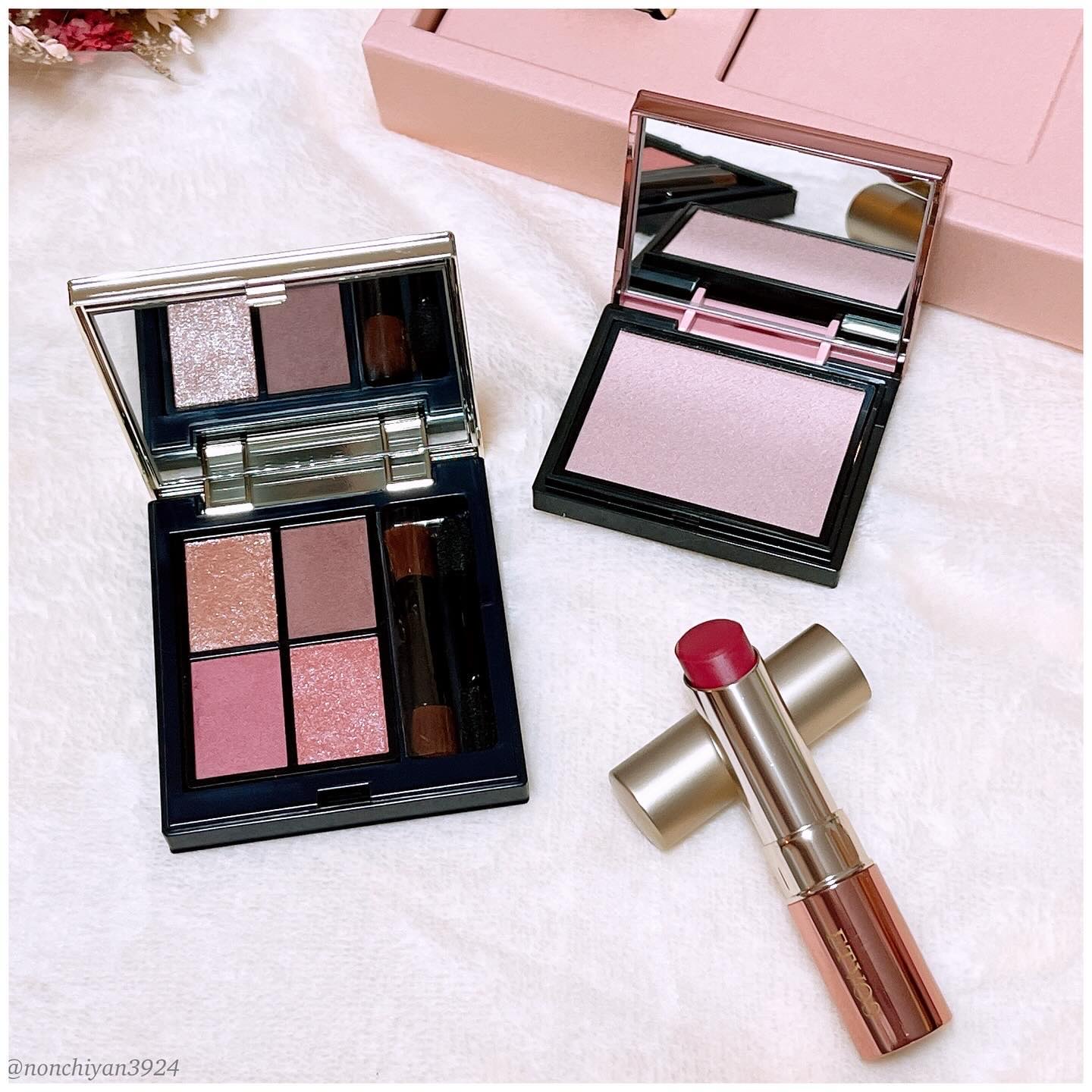 ニュアンスブロウパレットは7/2に発売でした♡02のピンク系💕優しい眉毛になります♥︎ チークカラーは、どんなアイメイクにも合いそうな色合い♡①から⑤を合わせています✨ 4色アイカラーは、秋にピッタリな色合い♡②が赤過ぎかなと思ったけど他の③色と馴染んで使いやすいです♥️ クリーミィティントは新商品です♡普段選ばない01にしてみました☺️アイカラーに合います♡ リップバームは、キラキラ、パール入でパープル系💜の色のリップ♡普段マスクの下や他のリップと合わせて使うといいかなと思います︎︎ᕷ ネイルラッカーはパール系の211♡秋🍁らしく可愛いです♡ チークブラシも限定品で普段のブラシよりピンク系で高級感があります︎︎ᕷ︎︎ᕷ︎︎ᕷ ポーチも限定品、とてもリボン🎀が可愛く、下の部分にファスナー付き、そこにブラシが入ります♡