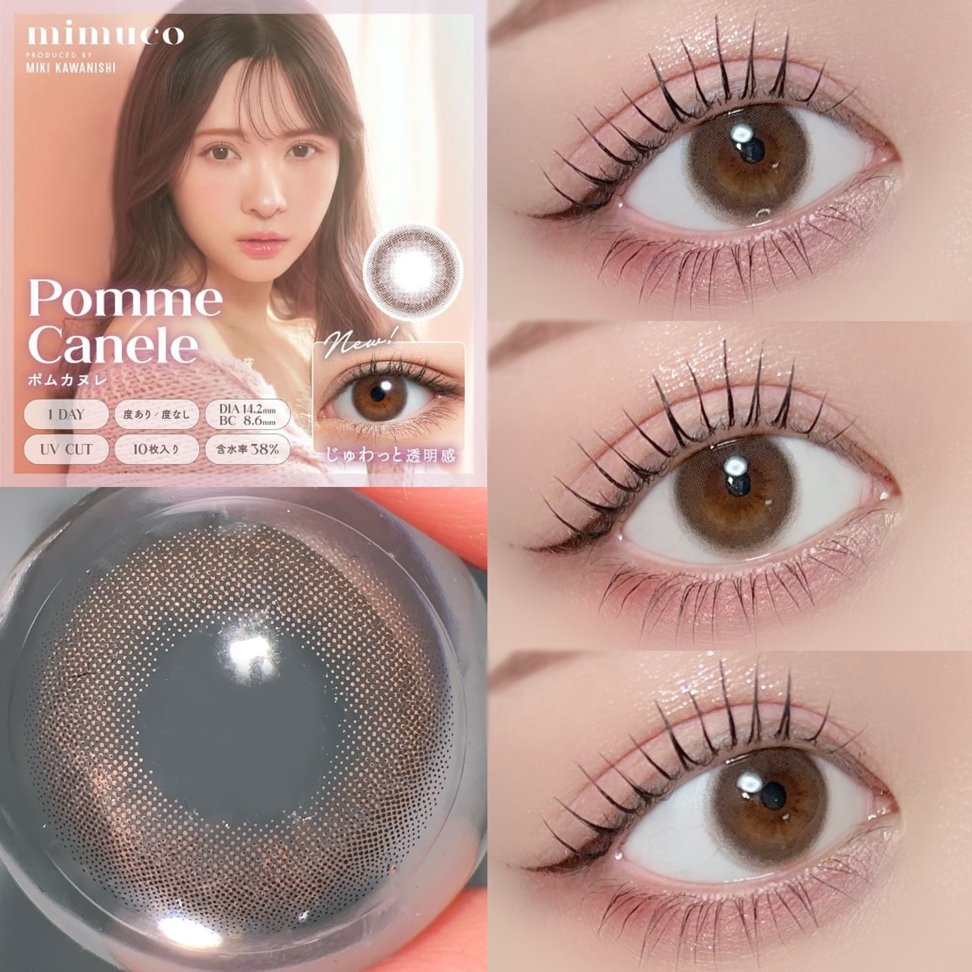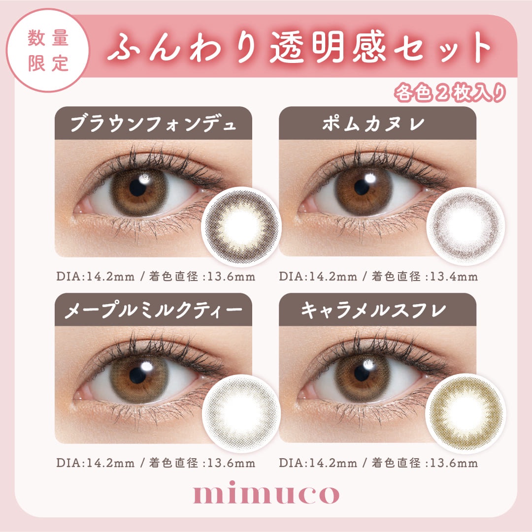 - ※2025年6月以降、商品パッケージ裏面・側面の一部表記を順次変更いたします。尚、これにかかる商品の交換・返品は承っておりません。 裸眼の色が明るい「茶目さん」、暗めな「黒目さん」、どちらの瞳の方が着けても不自然にならずあか抜けるレンズ。 日常使いしやすいブラウンベースのレンズをはじめ、肩ひじ張らずに可愛くなれるナチュラルなレンズとなっております。 ■mimuco ふんわり透明感セット キャラメルスフレ/ブラウンフォンデュ/メープルミルクティー/ポムカヌレ(各2枚入り) ■mimucoちゅるん透明感セット ゼリーグレー/シュガードーナツ/メローストロベリー/ピュレグレージュ(各2枚入り) カラーコンタクトレンズの不適正使用による眼障害の危険性等などがあります。 ●コンタクトレンズは高度管理医療機器です。不十分な洗浄・消毒など不適切なケアや、長時間・交換期間を超えた装用により、アレルギー性結膜炎、角膜感染症、角膜潰瘍等の重篤な眼障害が発生する危険性があります ●ご使用前に取扱説明書を確認してください 使用上の留意事項 ●眼科医院等を受診してからお求めください ●眼に異常を感じたら直ちにレンズ使用を中止し、お近くの眼科等で診察を受けてください ●医師の指示にしたがってご使用ください ●コンタクトレンズを装用する場合、自覚症状がなくても、眼科医院等での定期検査を受けてください ●レンズに不具合がある場合は使用しないでください
