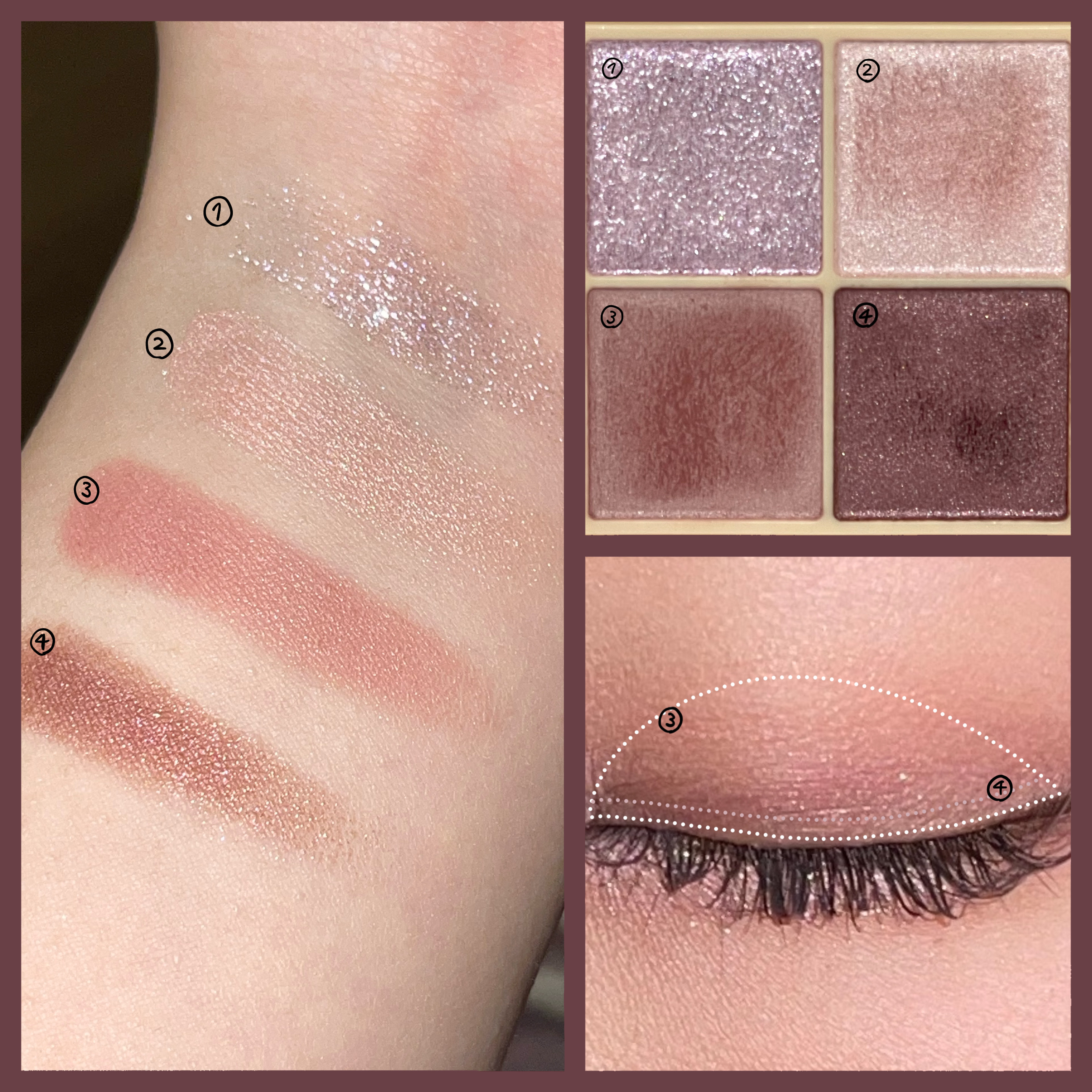 - ラメ・パール・マット3質感の4色アイシャドウ。 肌馴染みの良いベージュを基調としたカラー。ラメ・パール・マットの3質感を重ねて、自然にまぶたを強調し奥行のある大きな目元へ。 しっとり溶け込むような柔らかなパウダーなので、スルスル伸びてまぶたにピタッと密着。保湿成分(スクワラン・ホホバ種子油)配合。