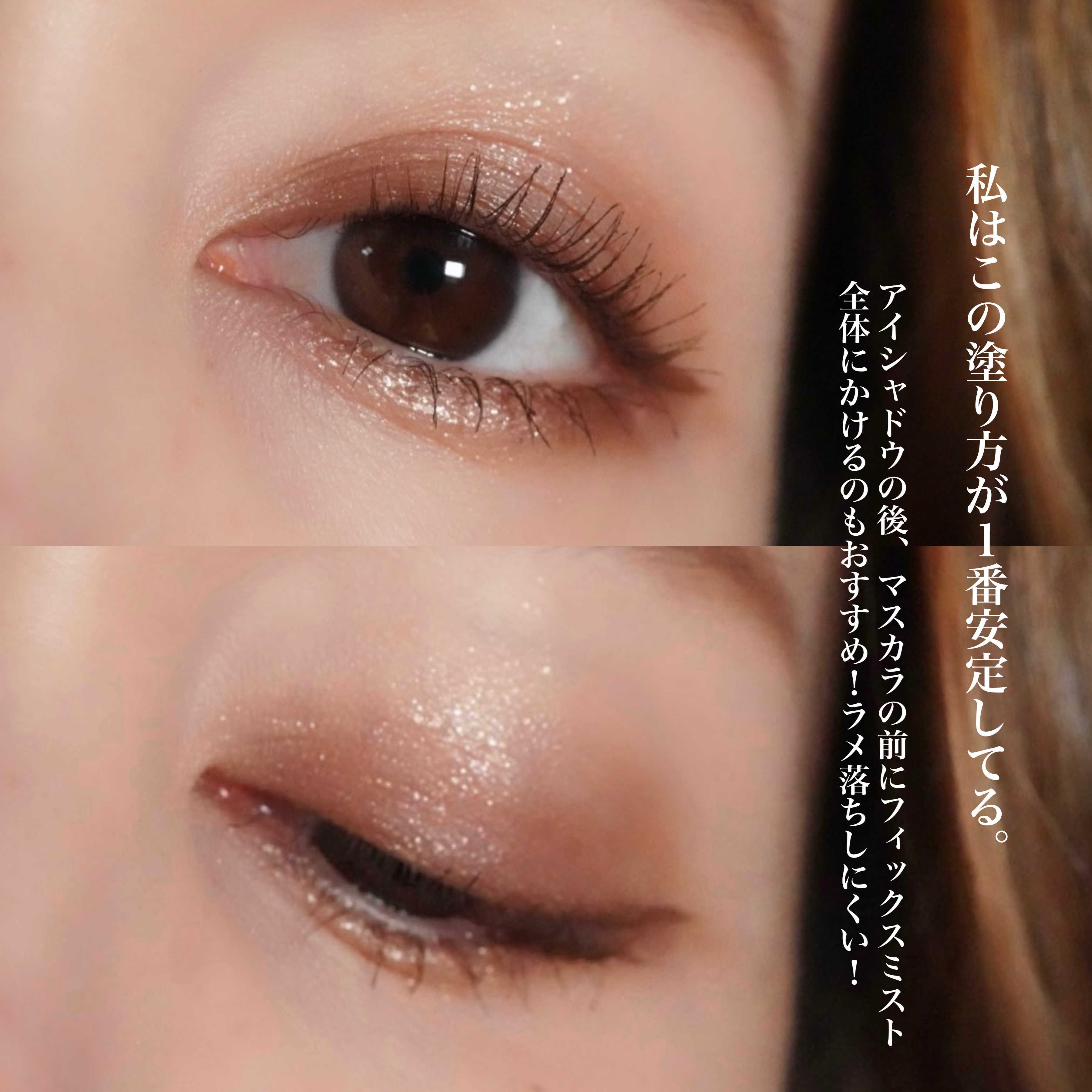 マットなレッドブラウンと多色ラメ🤩!!✨マスカラはブラック×ブラウンで👀💕✨私の好きな組み合わせ\♡/"マット2色で簡単グラデーションをして指で多色ラメを重ねる❕✨涙袋には、小さめのチップで涙袋中央だけにちょん。たっぷりめにのせるのが好き😍💓...