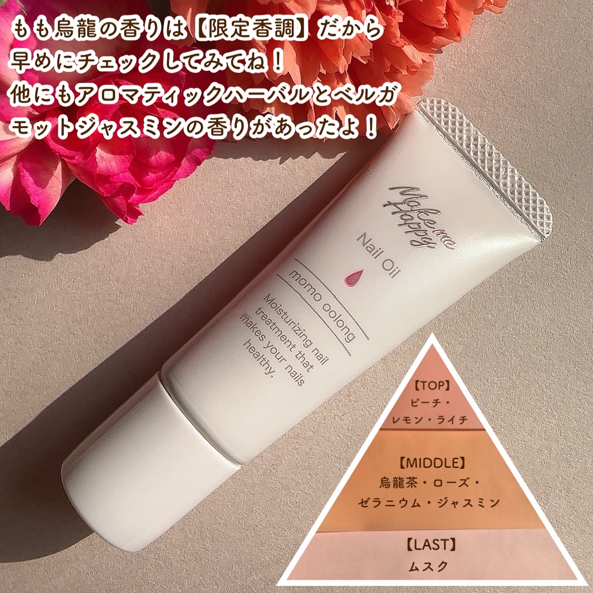 桃ウーロンの香り🍑高保湿ネイルオイル💅【CANMAKEメイクミーハッピーネイルオイルmomooolong】ささくれや爪の割れ欠けがひどく毎日ネイルオイル塗る時間も取れず移動時間にササッとケアしたくてレビューの良いこれ使ってみた‼︎チューブタイ...