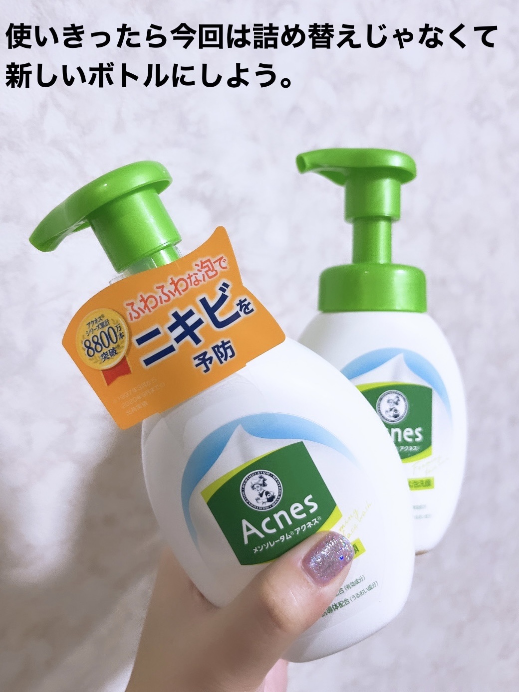 【使った商品】メンソレータムアクネス薬用ふわふわな泡洗顔160mL【商品の特徴】医薬部外品使いやすいポンプタイプさわやかシトラスの香り(微香性)うるおい誘導体配合で肌がつっぱらないニキビのもとになるアクネを抑えてニキビを防ぐ🥰泡立ていらずで便...