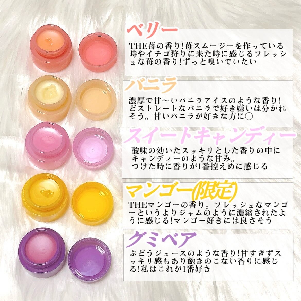 夜寝る前にたっぷり塗っておくと翌朝乾燥知らずです🫶🏻 メイク前の唇の保湿としてもいいと思います💄 香りもベリー、グレープフルーツ、バニラ、スイートキャンディ、グミベアの5種類から選べます! 試供品で使用したところかなり良かったので現品を購入しました!