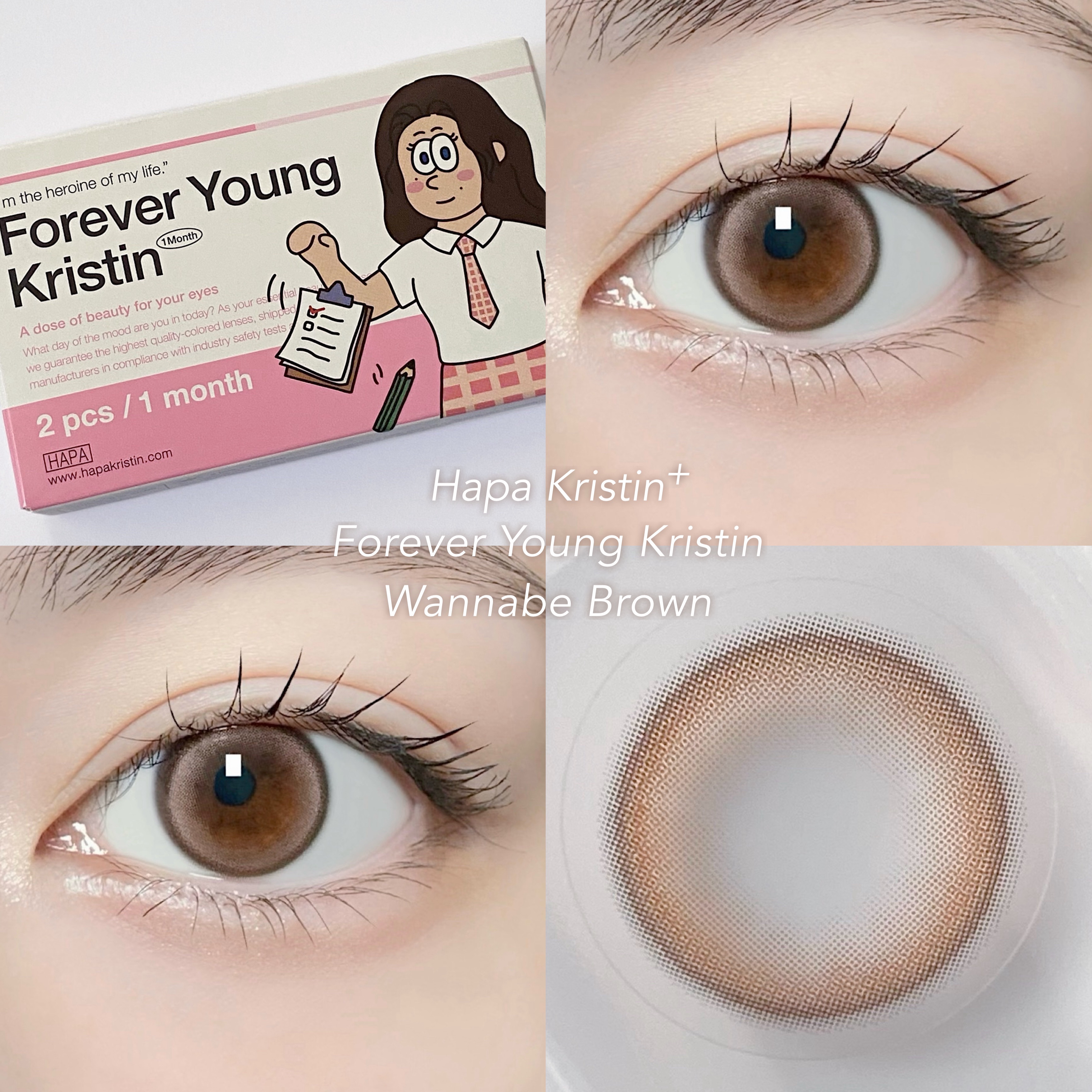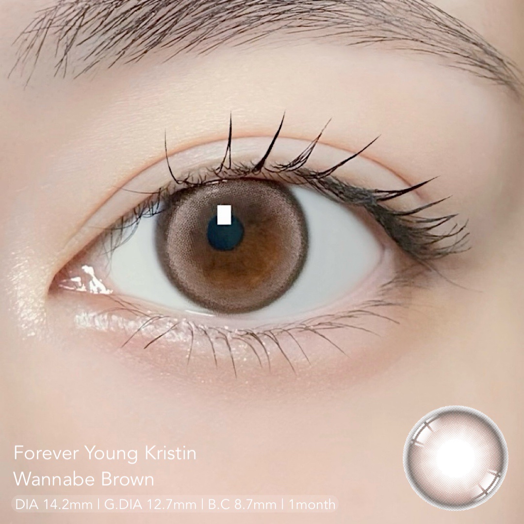 ほんのりピンクな明るいブラウンカラーで透明感があって可愛い♡♡ フチありで瞳もくっきり見えるよ✨ Hapa kristinのフォーエバーヤングクリスティン ワナビーブラウンをつけたよ✨🌸
