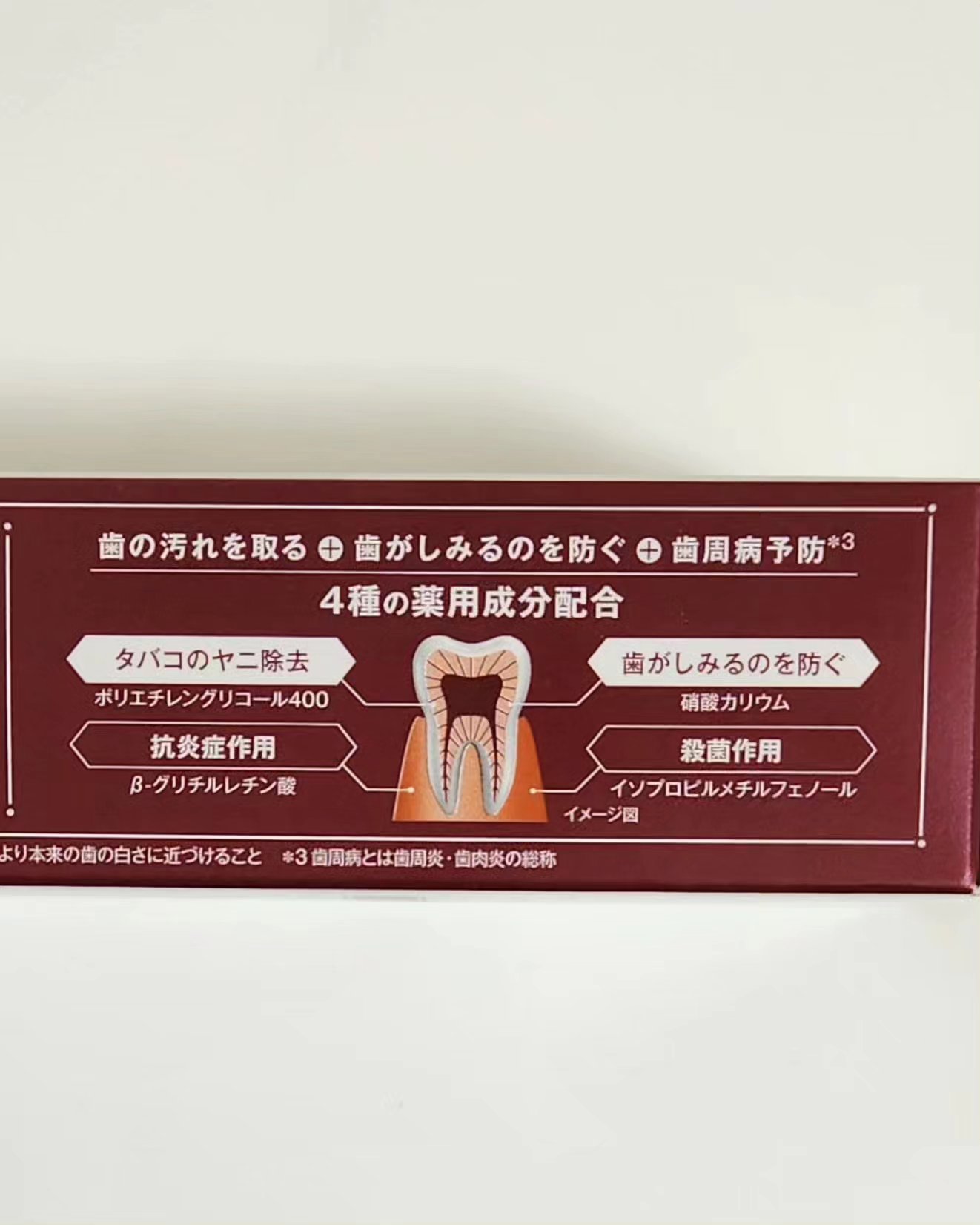 - <60g> ソルビット液、濃グリセリン、精製水、無水ケイ酸、硝酸カリウム、ポリエチレングリコール400、β-グリチルレチン酸、イソプロピルメチルフェノール、リン酸三カルシウム、ヒドロキシアパタイト、ケイ酸カルシウム、香料(フレッシュミントタイプ)、キシリット、サッカリンナトリウム、カルボキシメチルセルロースナトリウム、キサンタンガム、ポリオキシエチレン硬化ヒマシ油、ラウロイルサルコシンナトリウム、ヤシ油脂肪酸アミドプロピルベタイン液、酸化チタン、l-メントール <トライアル 20g> ソルビット液、濃グリセリン、精製水、無水ケイ酸、硝酸カリウム、ポリエチレングリコール400、β-グリチルレチン酸、イソプロピルメチルフェノール、リン酸三カルシウム、ヒドロキシアパタイト、ケイ酸カルシウム、香料(フレッシュミントタイプ)、キシリット、サッカリンナトリウム、カルボキシメチルセルロースナトリウム、キサンタンガム、ポリオキシエチレン硬化ヒマシ油、ラウロイルサルコシンナトリウム、ヤシ油脂肪酸アミドプロピルベタイン液、酸化チタン、l-メントール
